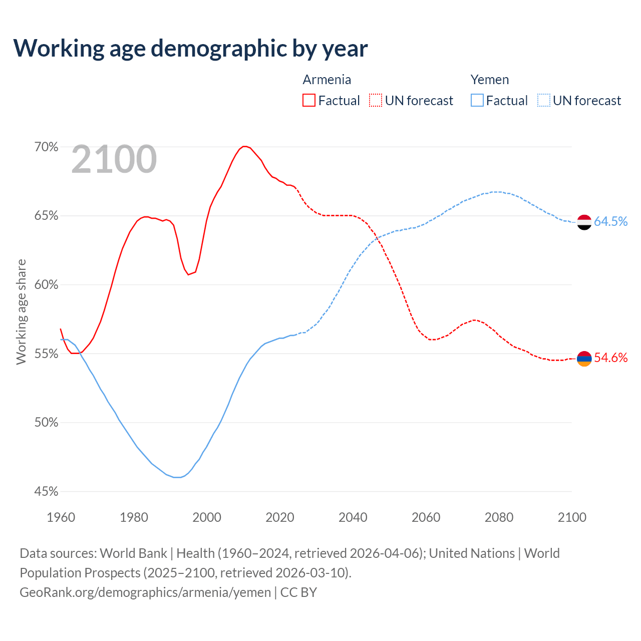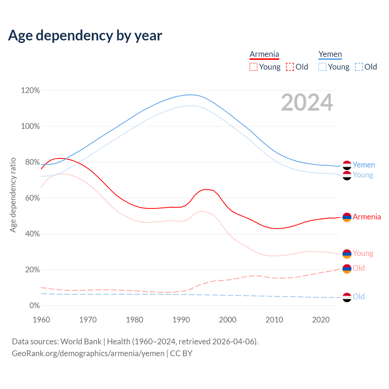 - The share of old-age demographic (65+) in Armenia is 13.7% vs 2.52% in Yemen.