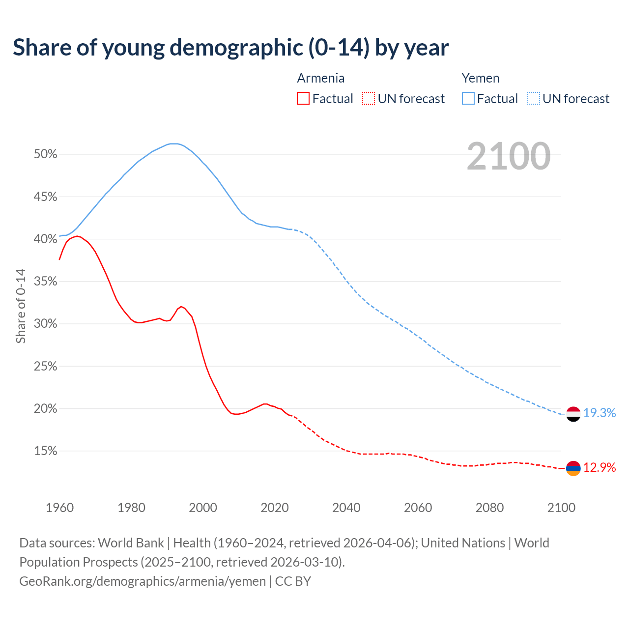 - The share of young demographic (0-15 years old) in Armenia is 19.2% vs 41.1% in Yemen.