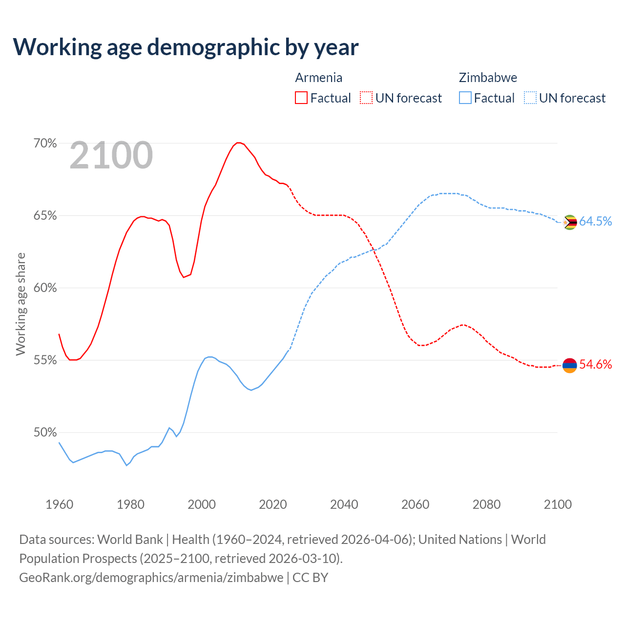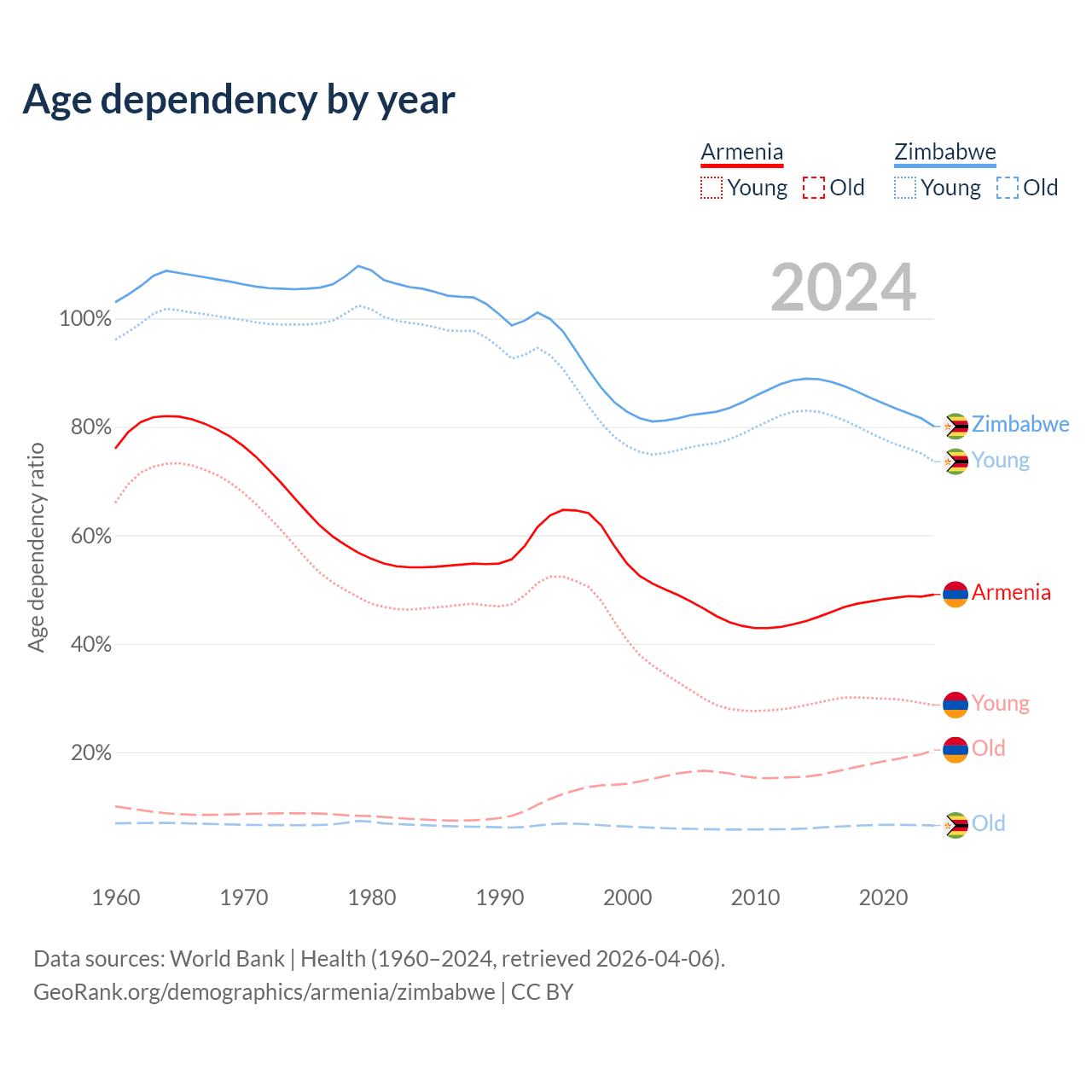 The share of older people aged 65 and over is 13.7% in Armenia and 3.6% in Zimbabwe. Life expectancy in Armenia compared to Zimbabwe .