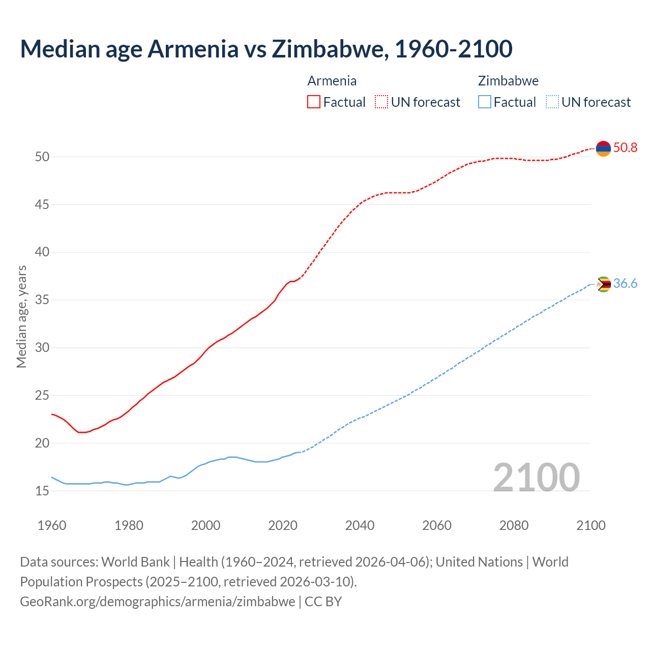 Median age Armenia vs Zimbabwe, 1960-2100