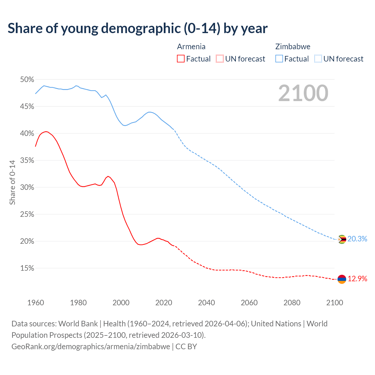 - The share of young demographic (0-15 years old) in Armenia is 19.2% vs 40.9% in Zimbabwe.