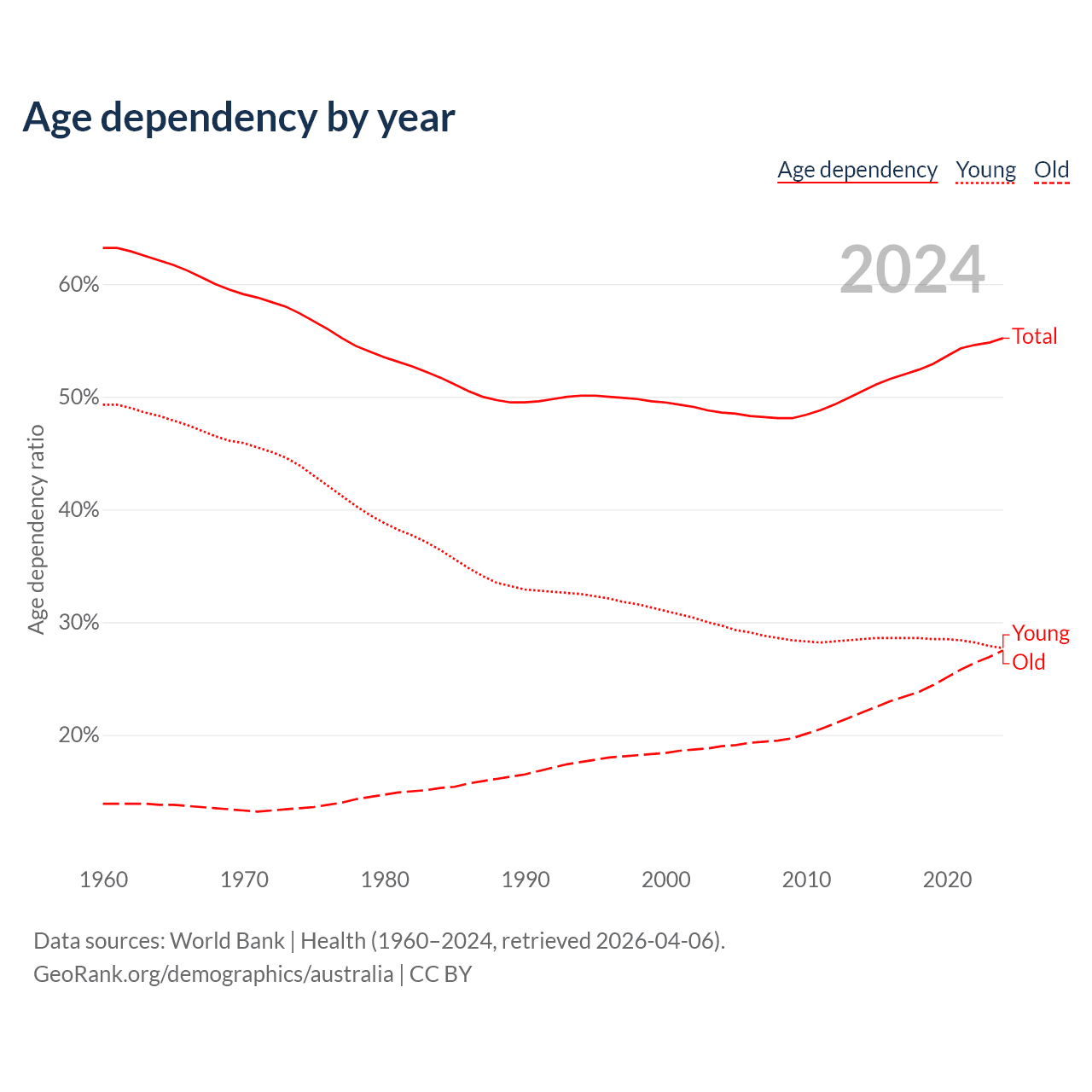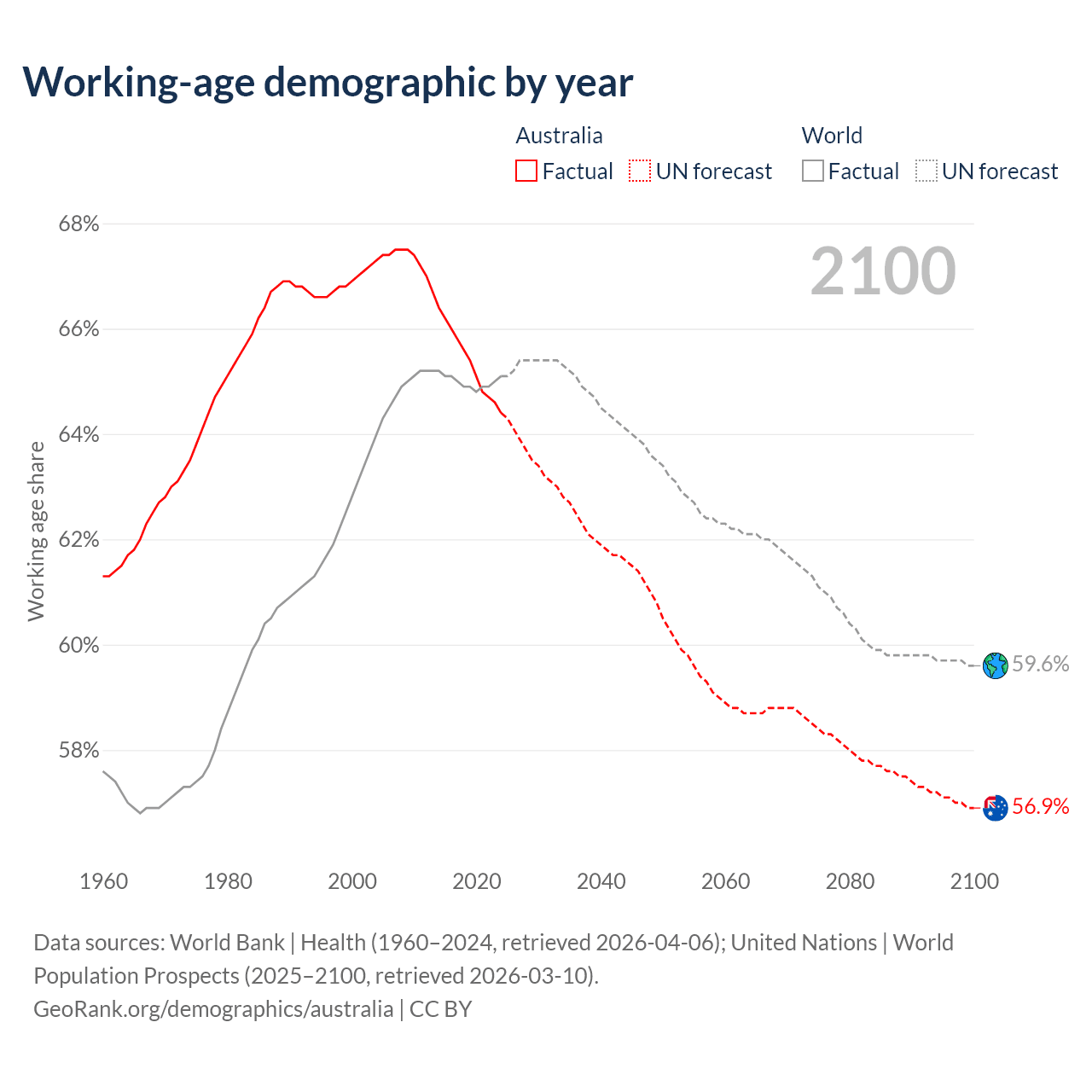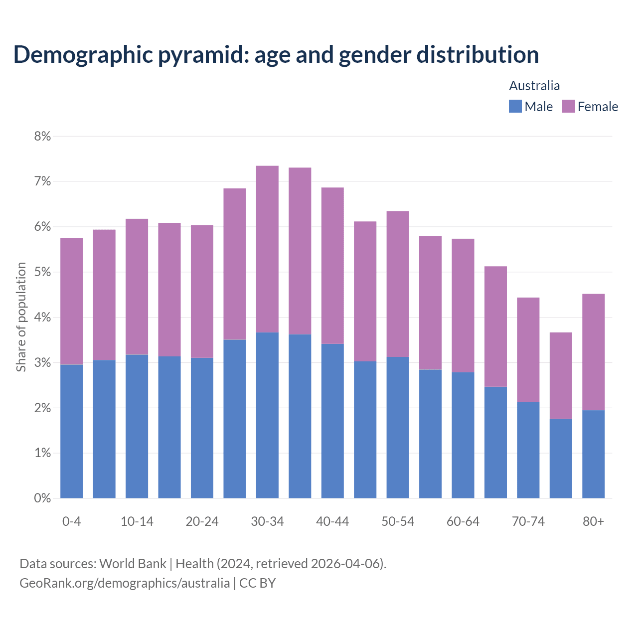 With a population of 27.2M people, Australia has a median age of 39 years which makes it the 55/196 oldest country. 17.8% of the demographic are children 0-14 years old, 64.4% are working-age people aged 15-64, and 17.7% are older population aged 65+ years.