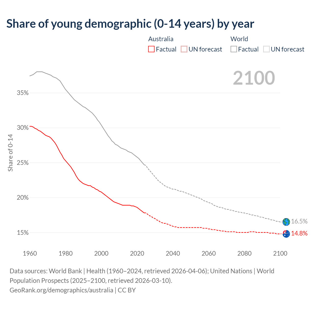 The share of children aged 0-14 in Australia decreased from 20% to 17.8% between 2004 and 2024 due to changes in birth rates.