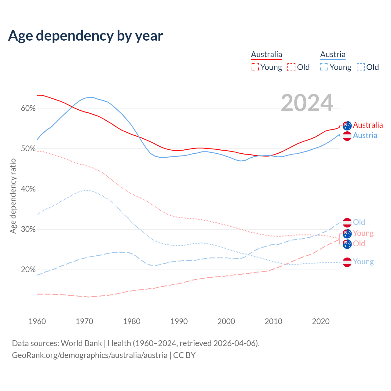 Data sources: World Bank | Health (1960–2024, retrieved 2026-04-06); U.S. Census Bureau (1960–2024, retrieved 2026-02-08).