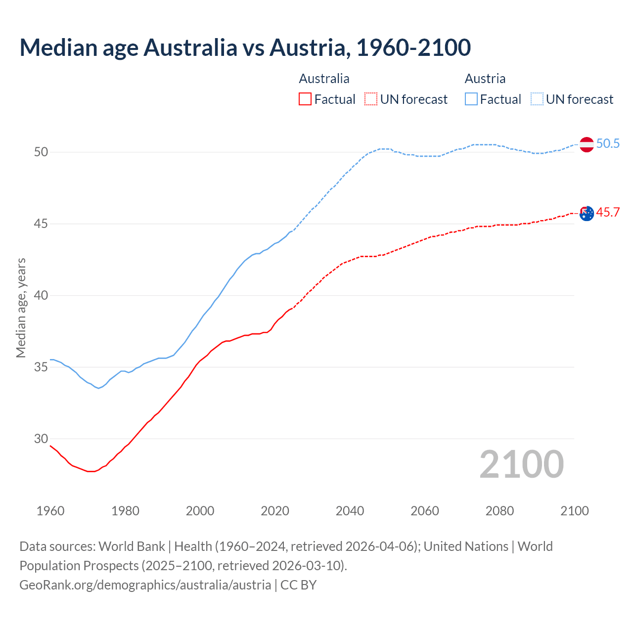 Median age Australia vs Austria, 1960-2100