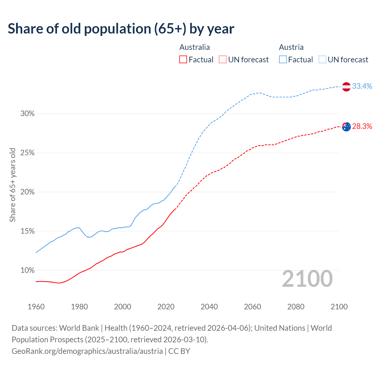 The share of older people aged 65 and over is 17.7% in Australia and 20.6% in Austria. Life expectancy in Australia compared to Austria .
