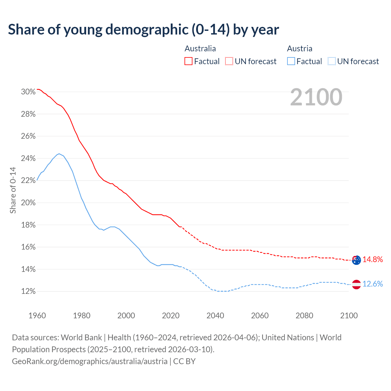 - The share of young demographic (0-15 years old) in Australia is 17.8% vs 14.2% in Austria.