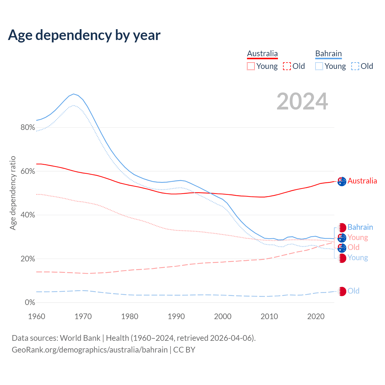 - Australia is ranked 55/196 by median age (oldest to youngest) vs 80/196 for Bahrain.