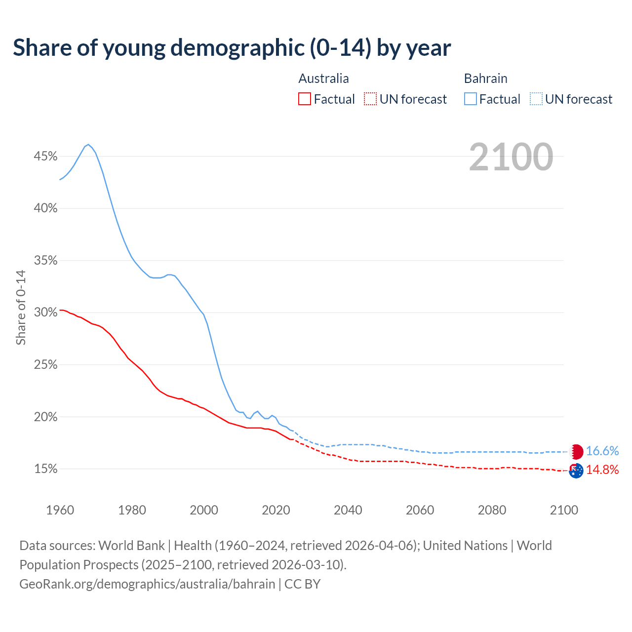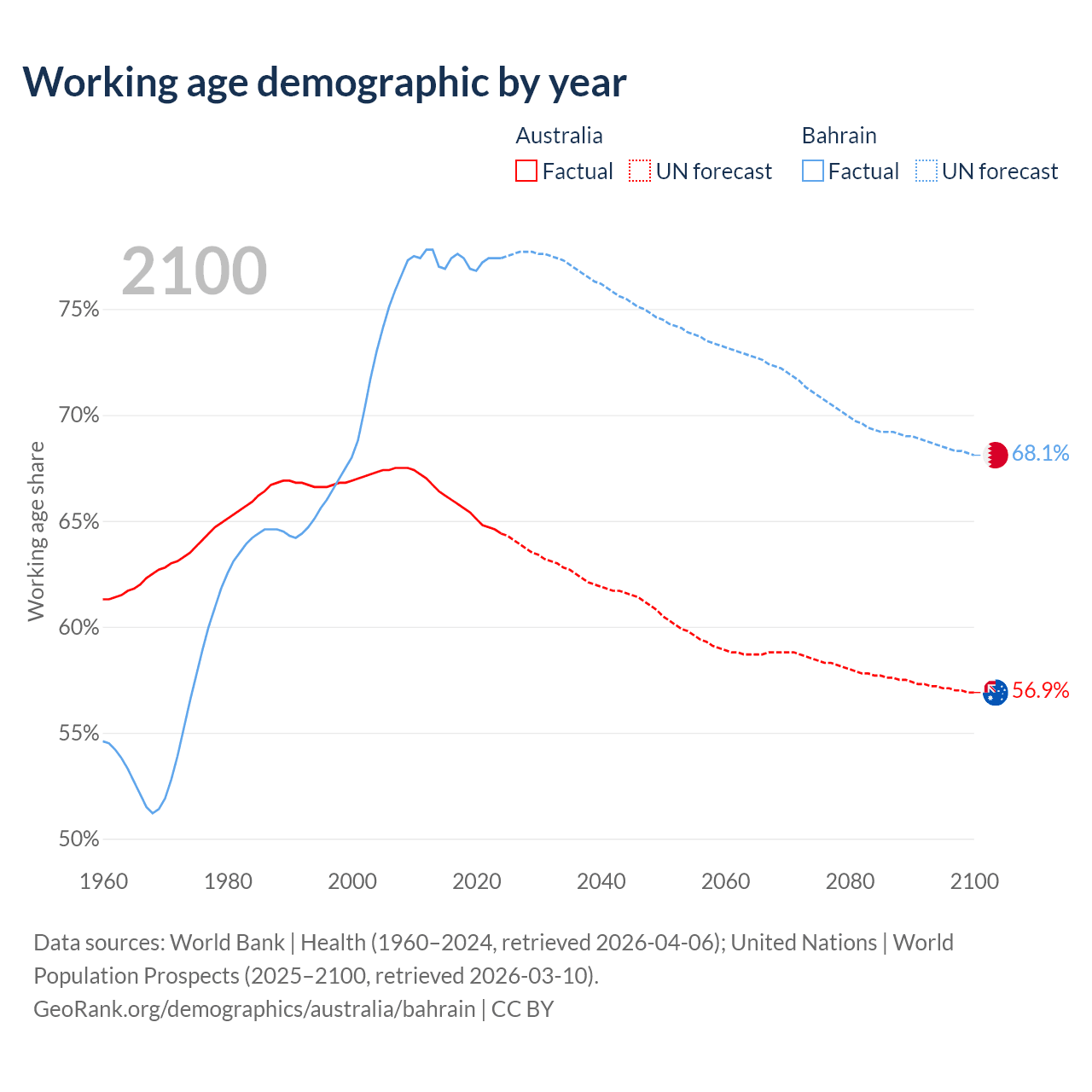 Median age Australia vs Bahrain, 1960-2100