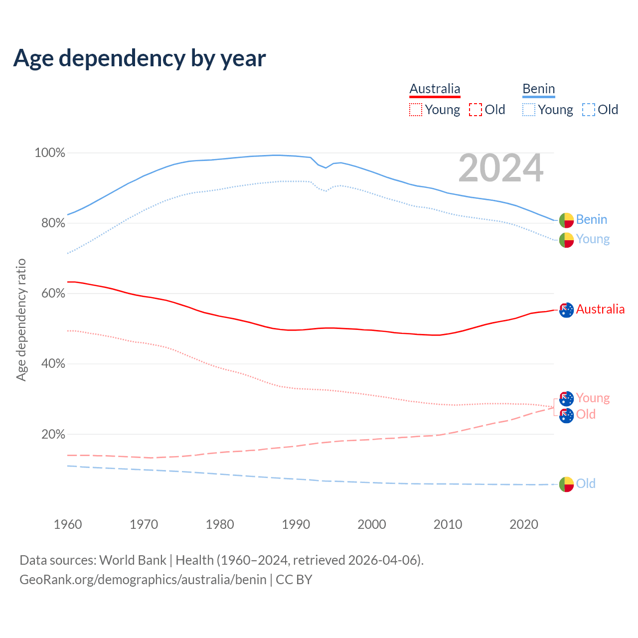 - Australia is ranked 55/196 by median age (oldest to youngest) vs 179/196 for Benin.