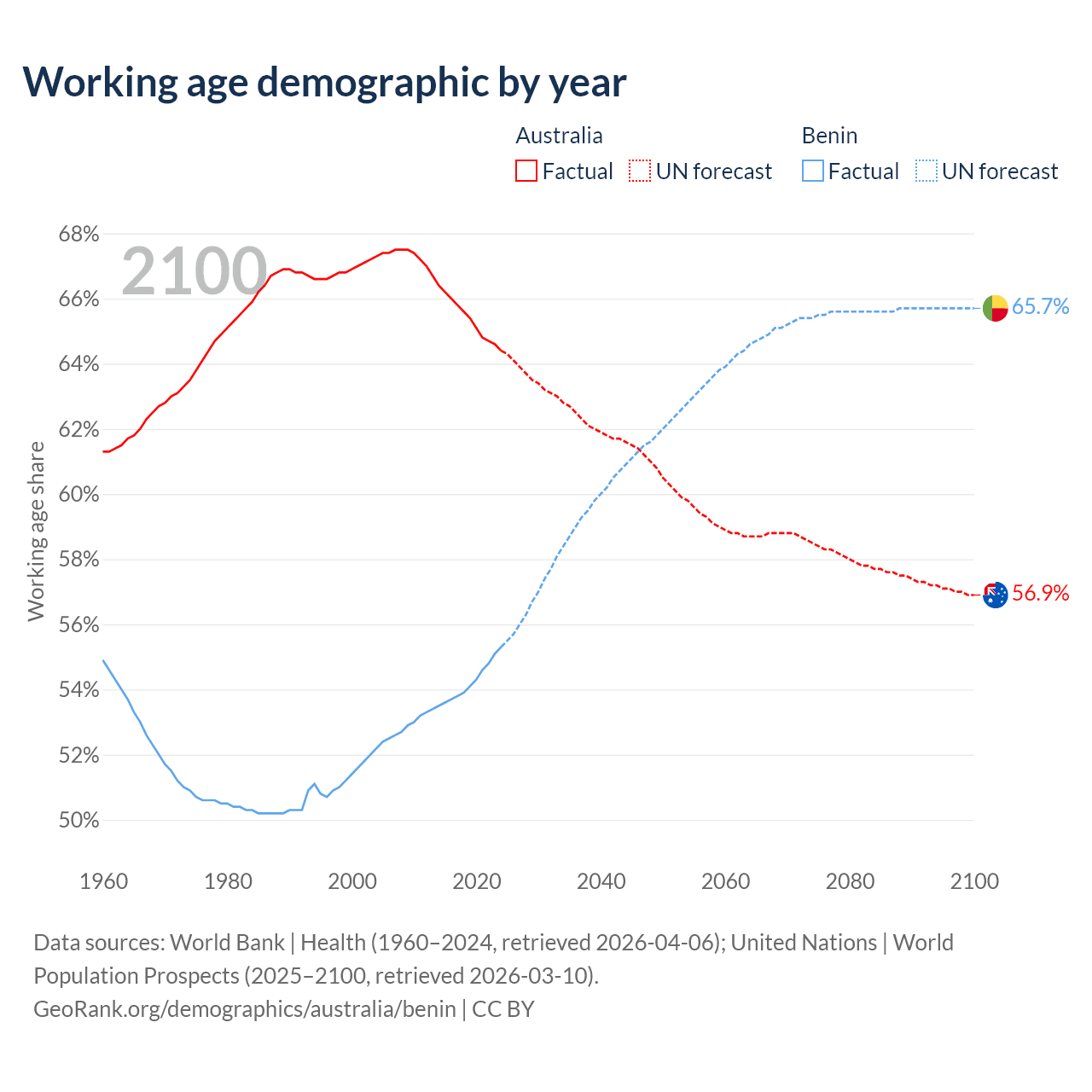 - Australia has 17.9M working age adults (aged 15-64) vs 8.45M in Benin.