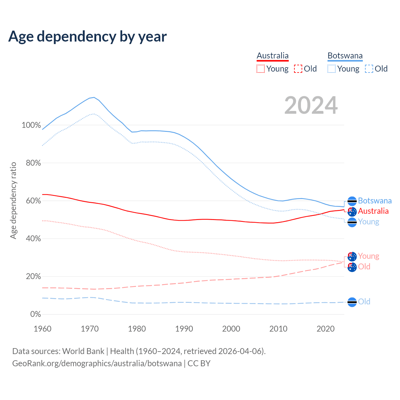 - The share of old-age demographic (65+) in Australia is 17.7% vs 4.04% in Botswana.