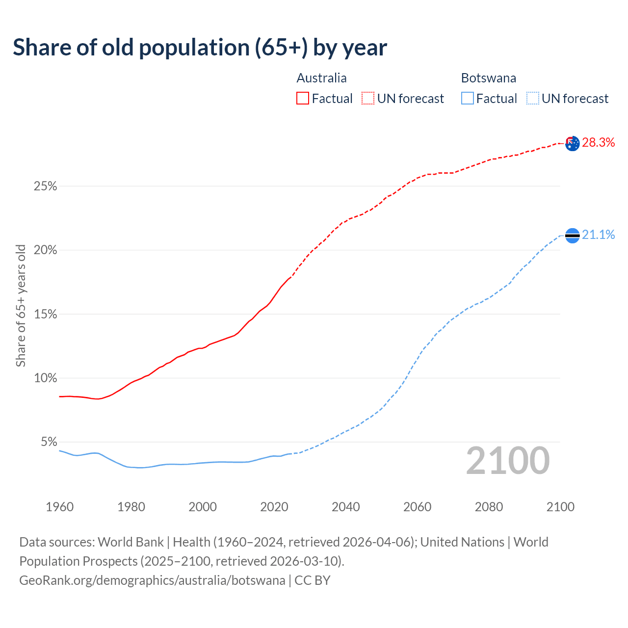The share of older people aged 65 and over is 17.7% in Australia and 4.04% in Botswana. Life expectancy in Australia compared to Botswana .