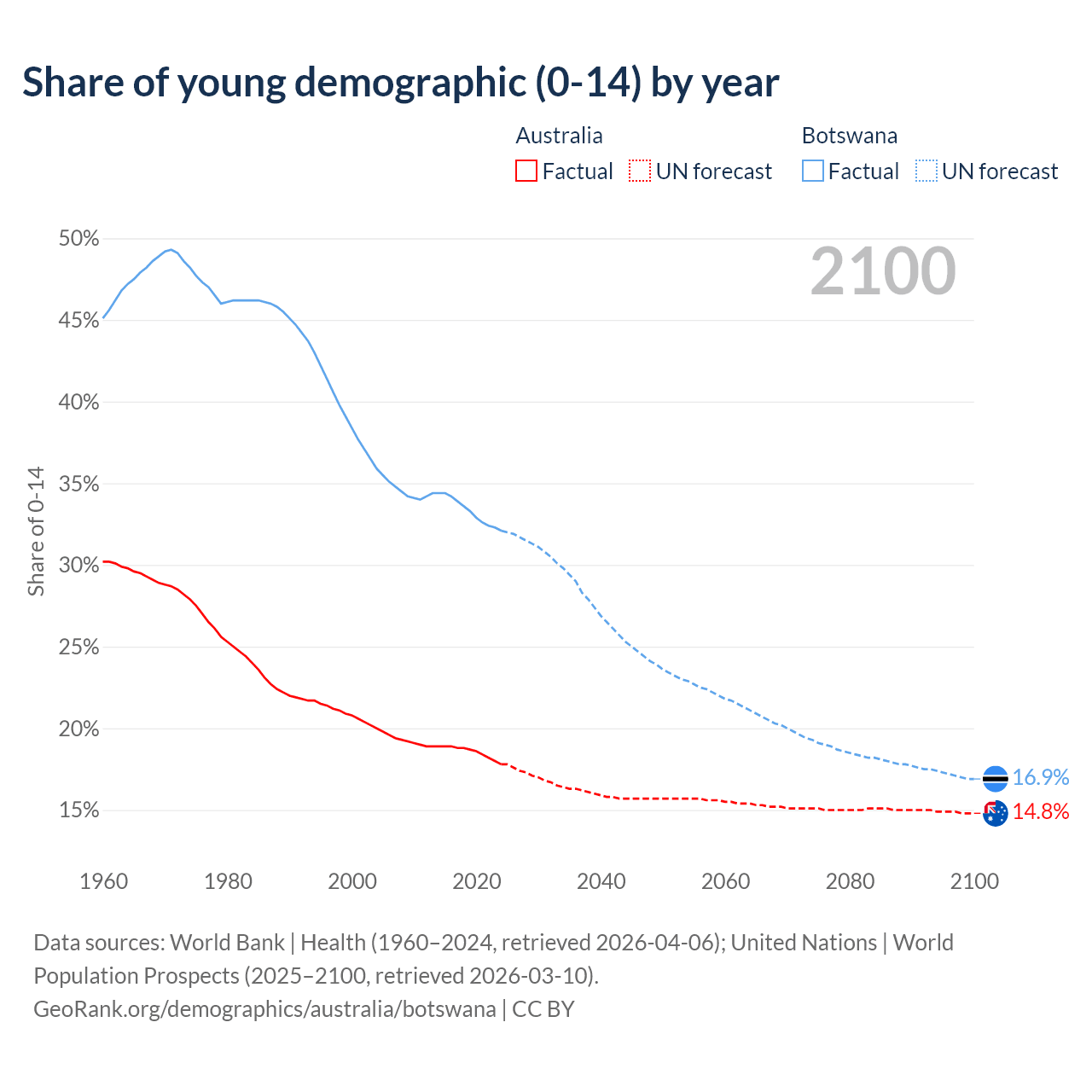 - The share of young demographic (0-15 years old) in Australia is 17.8% vs 32.1% in Botswana.