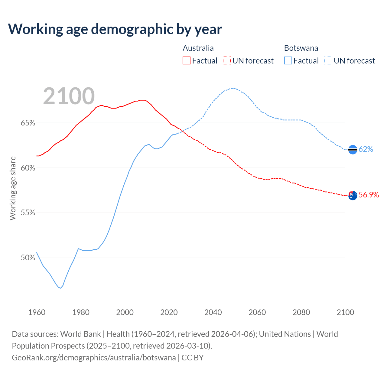 - Australia has 17.9M working age adults (aged 15-64) vs 1.67M in Botswana.
