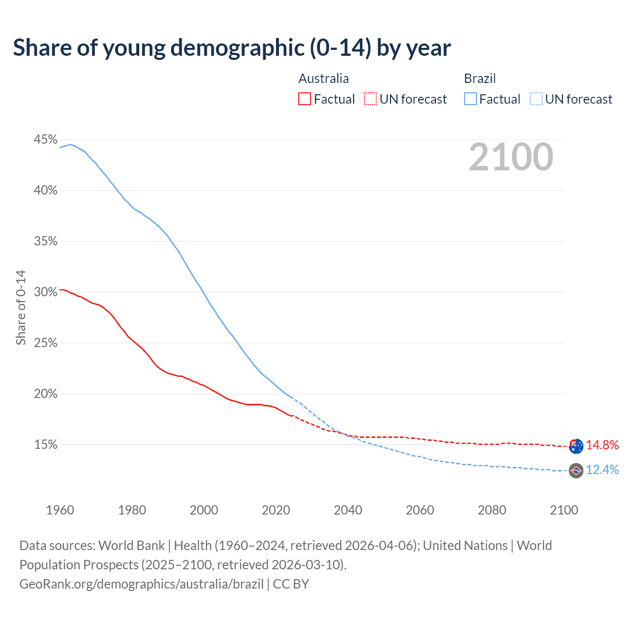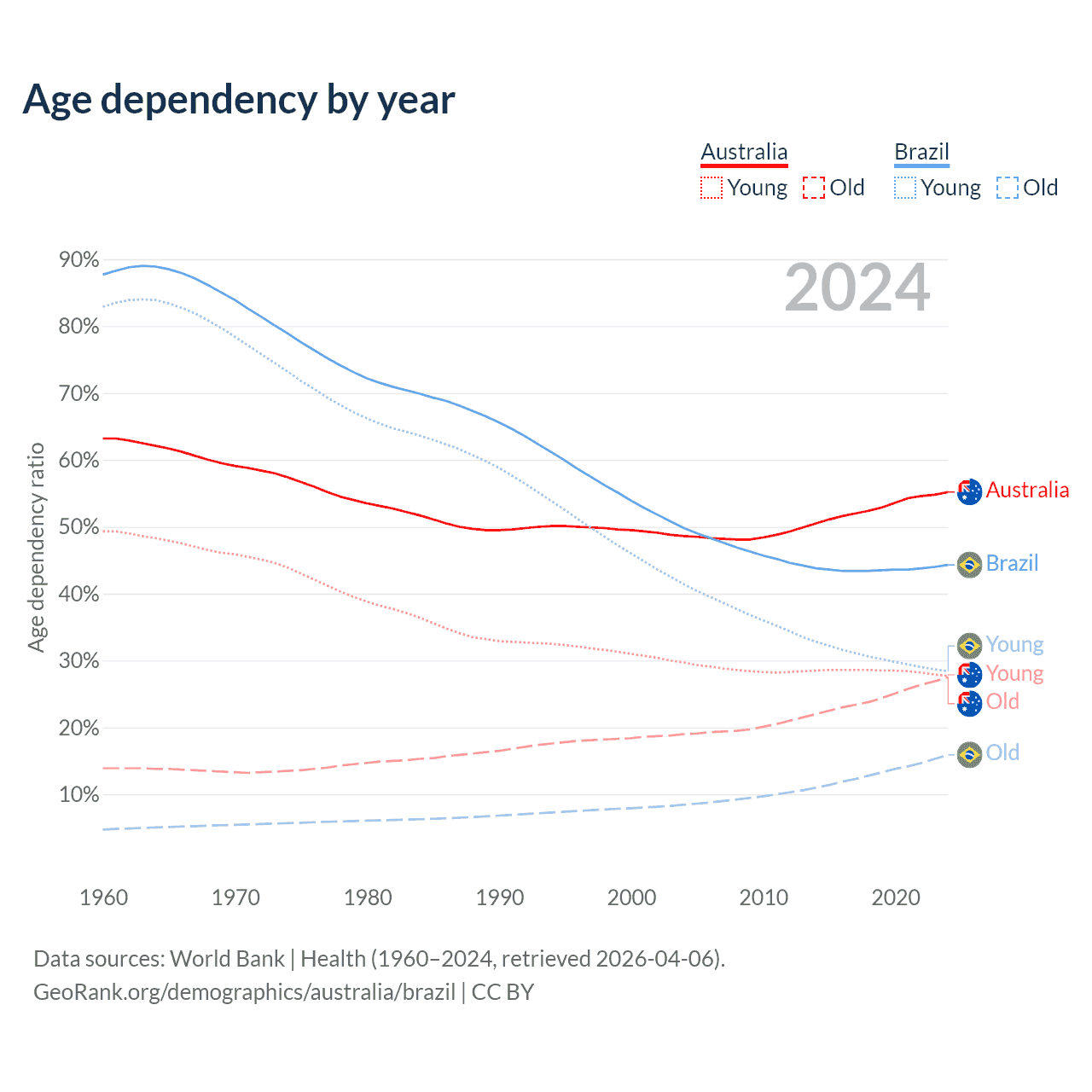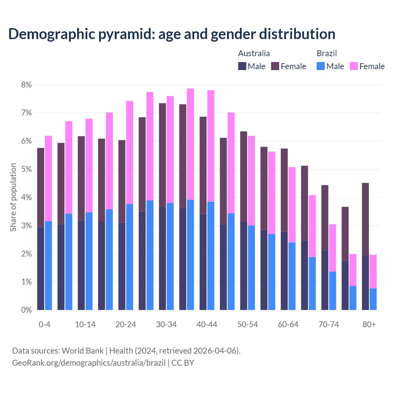 - Australia is ranked 55/196 by median age (oldest to youngest) vs 73/196 for Brazil.