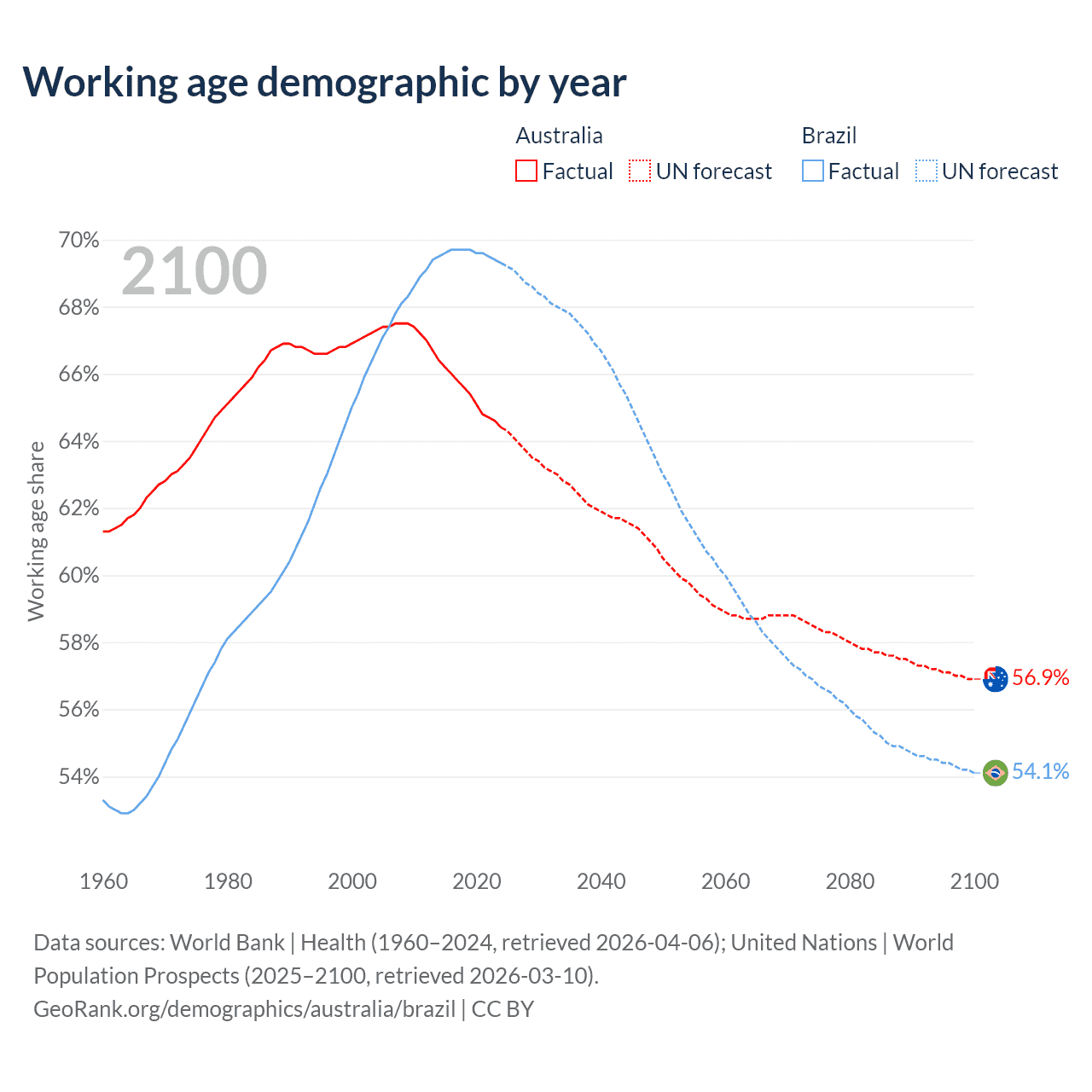 - Australia has 17.9M working age adults (aged 15-64) vs 148M in Brazil.