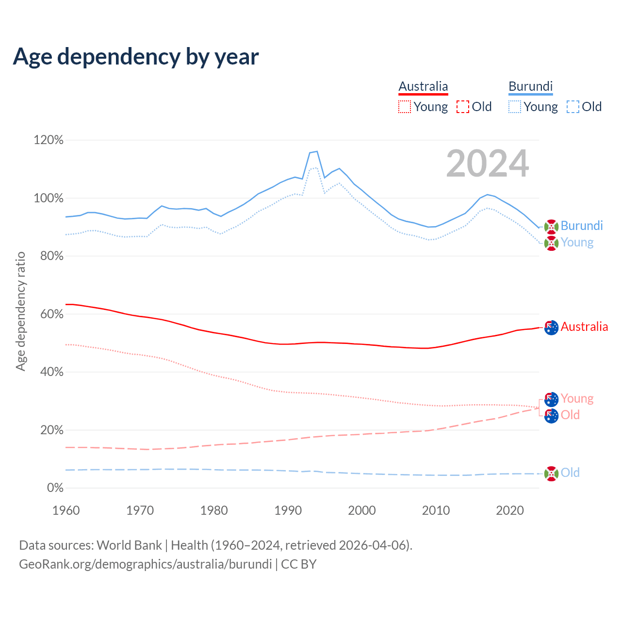 - The share of old-age demographic (65+) in Australia is 17.7% vs 2.53% in Burundi.