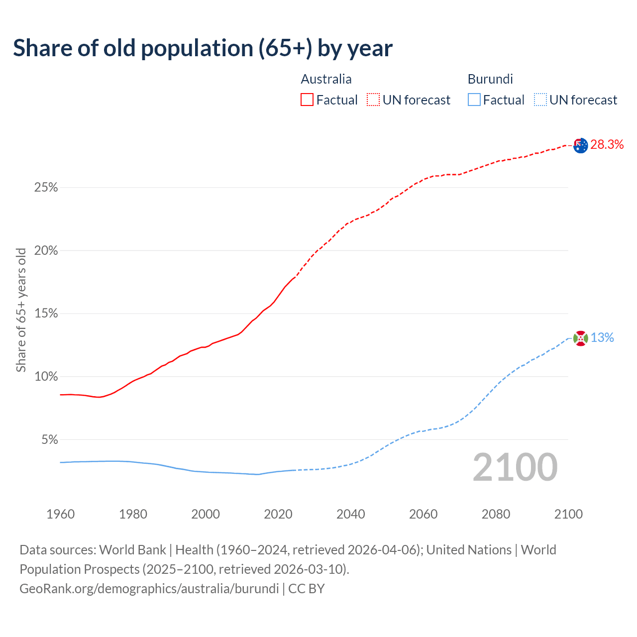The share of older people aged 65 and over is 17.7% in Australia and 2.53% in Burundi. Life expectancy in Australia compared to Burundi .