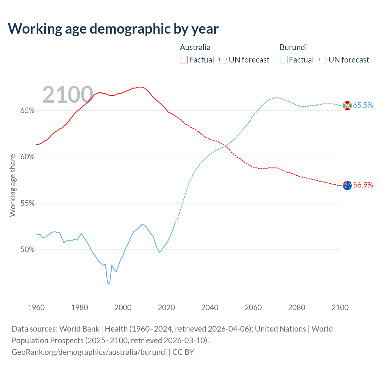 - Australia has 17.9M working age adults (aged 15-64) vs 7.83M in Burundi.