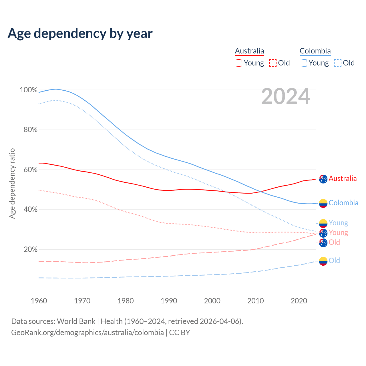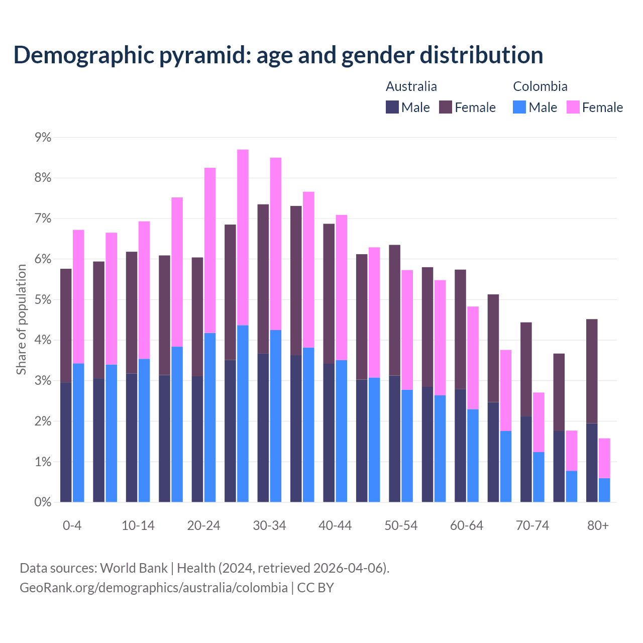 - Australia is ranked 55/196 by median age (oldest to youngest) vs 89/196 for Colombia.