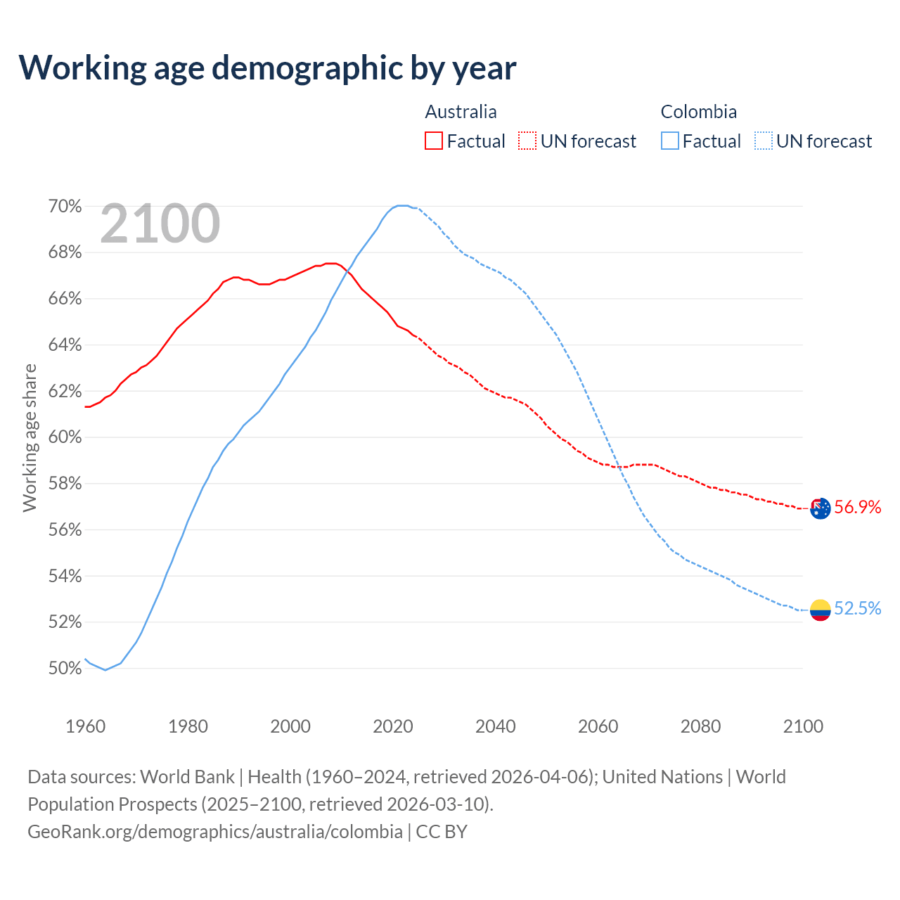 - Australia has 17.9M working age adults (aged 15-64) vs 37.8M in Colombia.