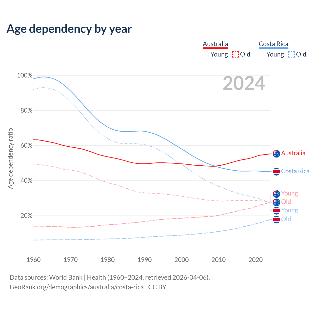 Data sources: World Bank | Health (1960–2024, retrieved 2026-04-06); U.S. Census Bureau (1960–2024, retrieved 2026-02-08).