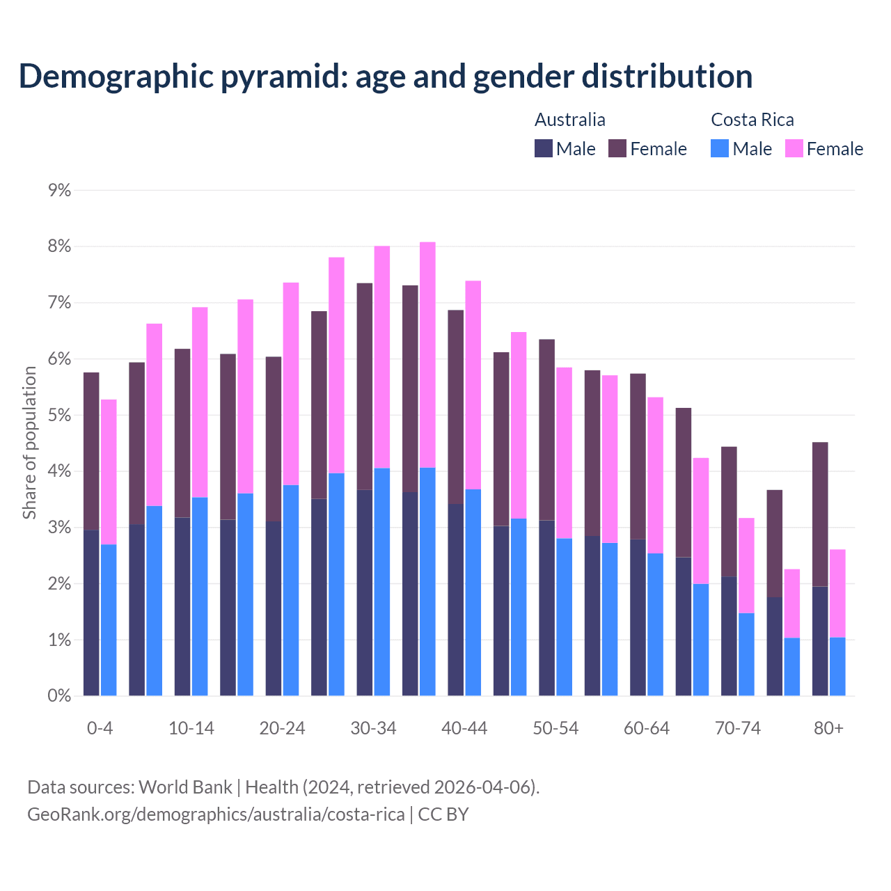 - The share of old-age demographic (65+) in Australia is 17.7% vs 12.2% in Costa Rica.
