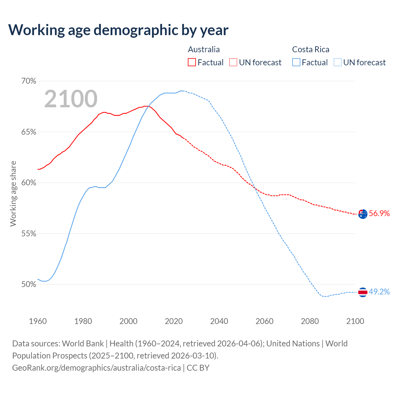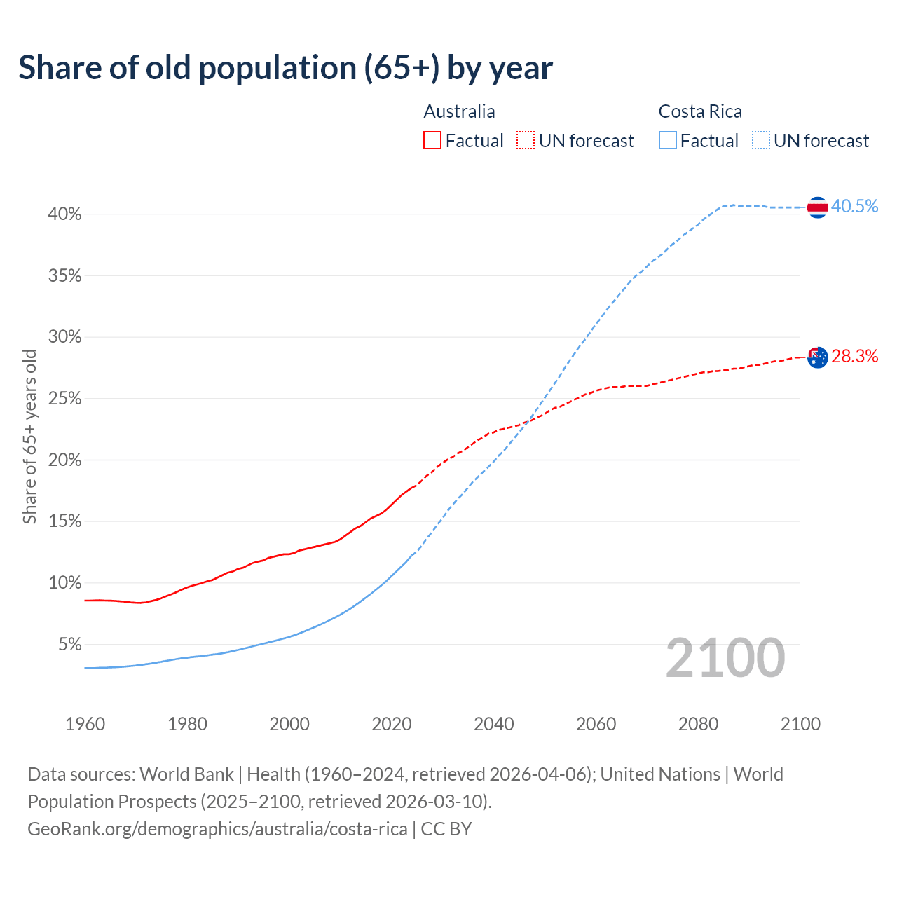 Median age Australia vs Costa Rica, 1960-2100