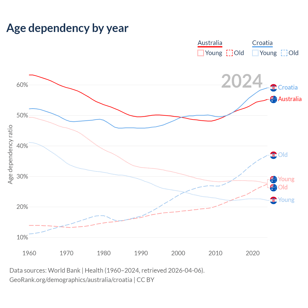 - Australia is ranked 55/196 by median age (oldest to youngest) vs 11/196 for Croatia.