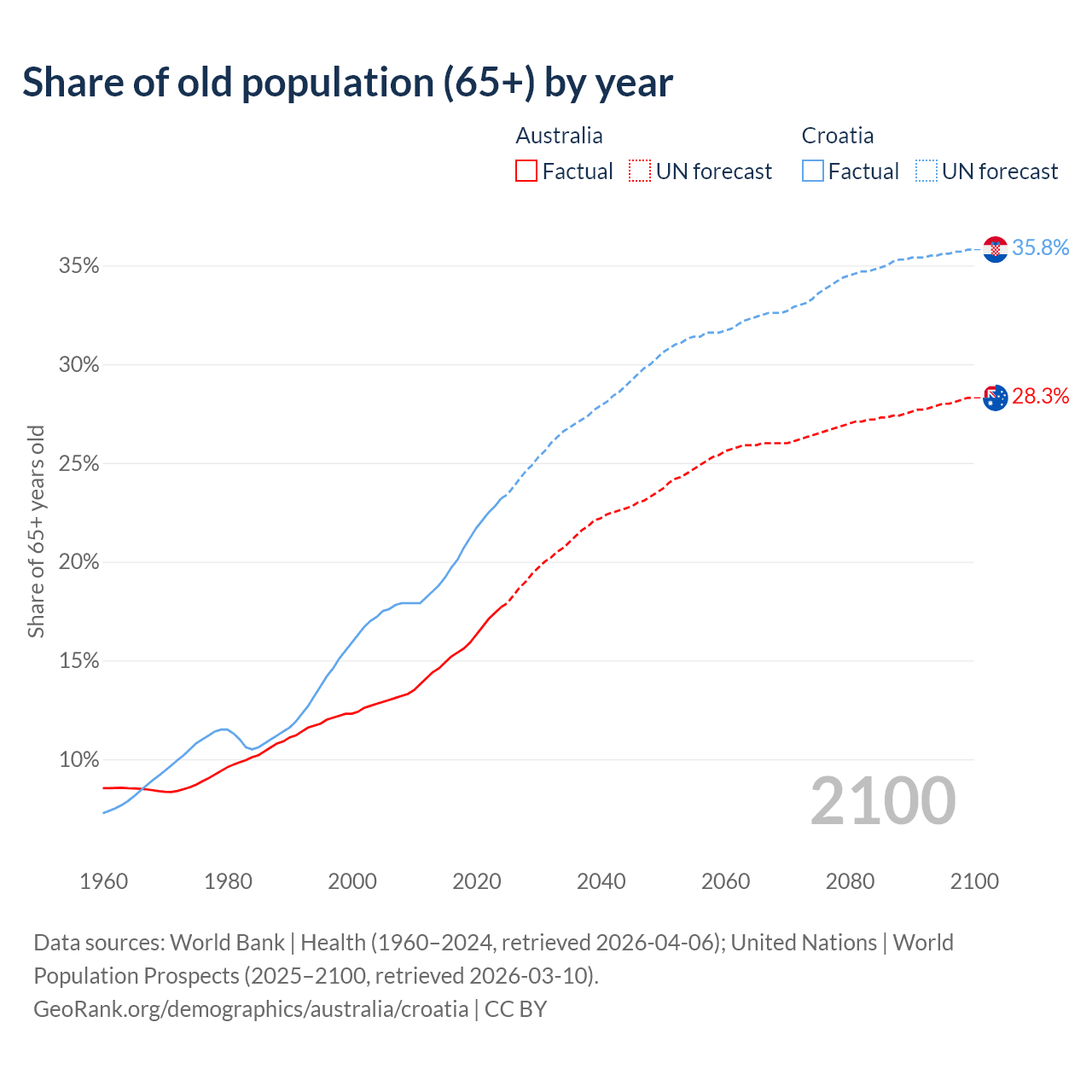 The share of older people aged 65 and over is 17.7% in Australia and 23.2% in Croatia. Life expectancy in Australia compared to Croatia .