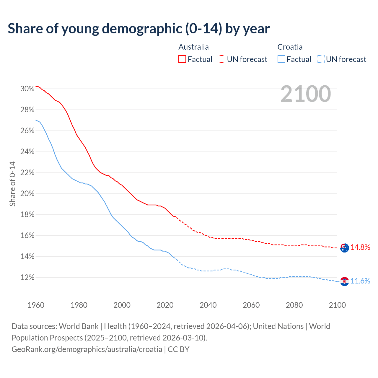 - The share of young demographic (0-15 years old) in Australia is 17.8% vs 13.9% in Croatia.