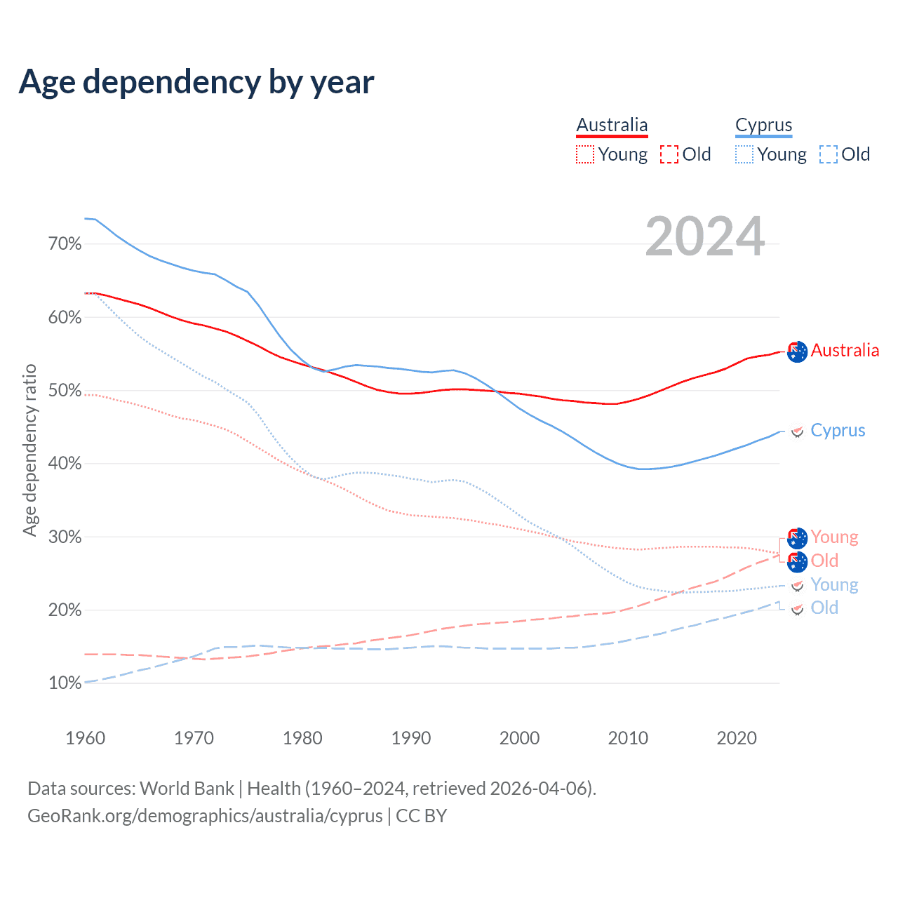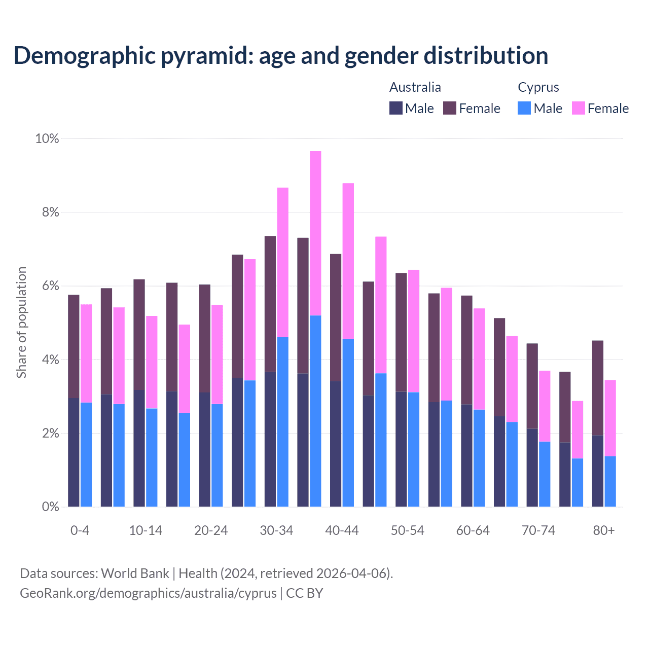 - Australia is ranked 55/196 by median age (oldest to youngest) vs 52/196 for Cyprus.