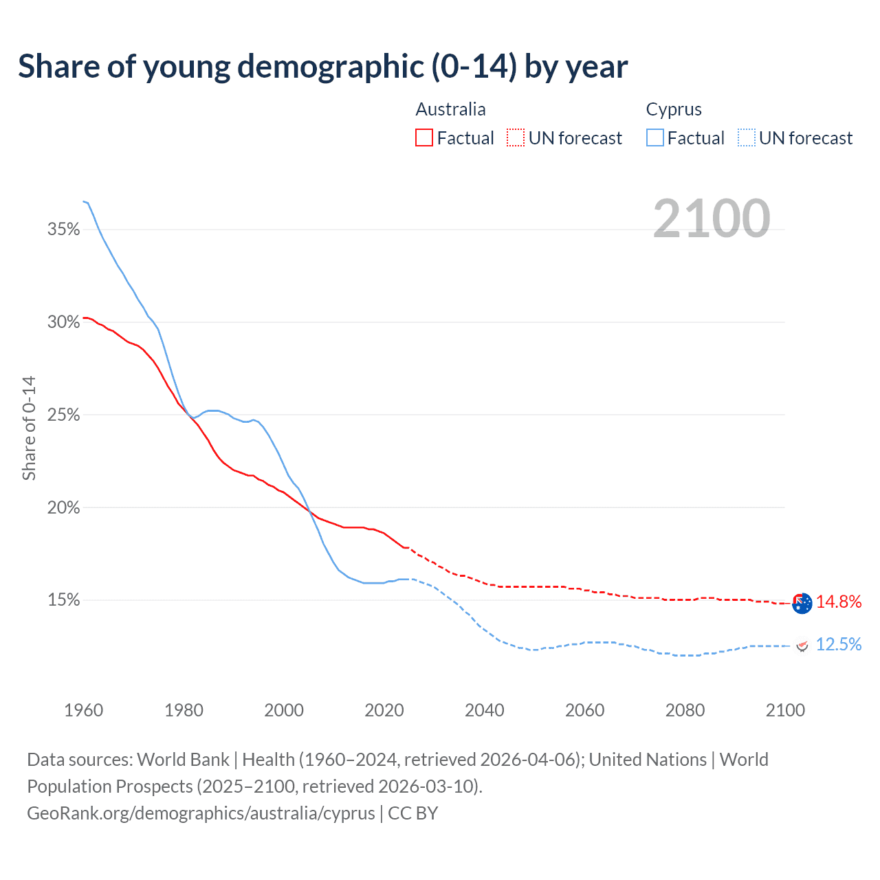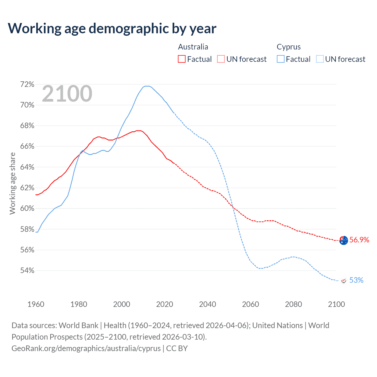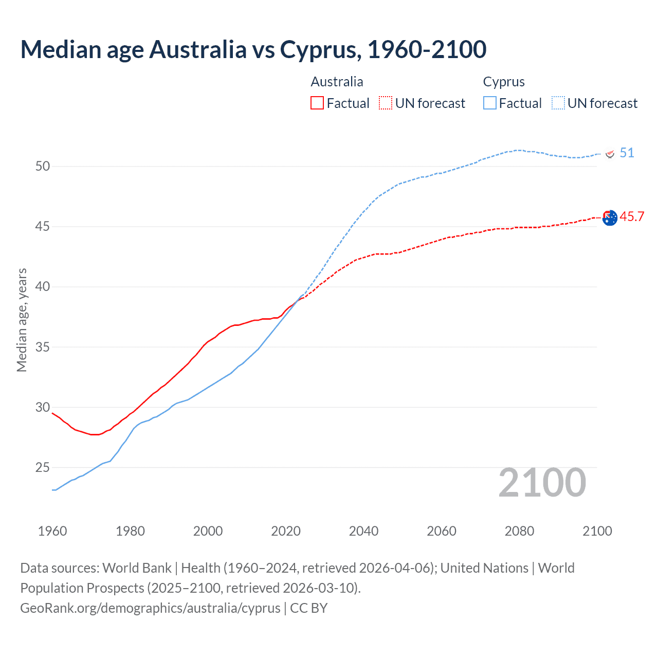 Median age Australia vs Cyprus, 1960-2100