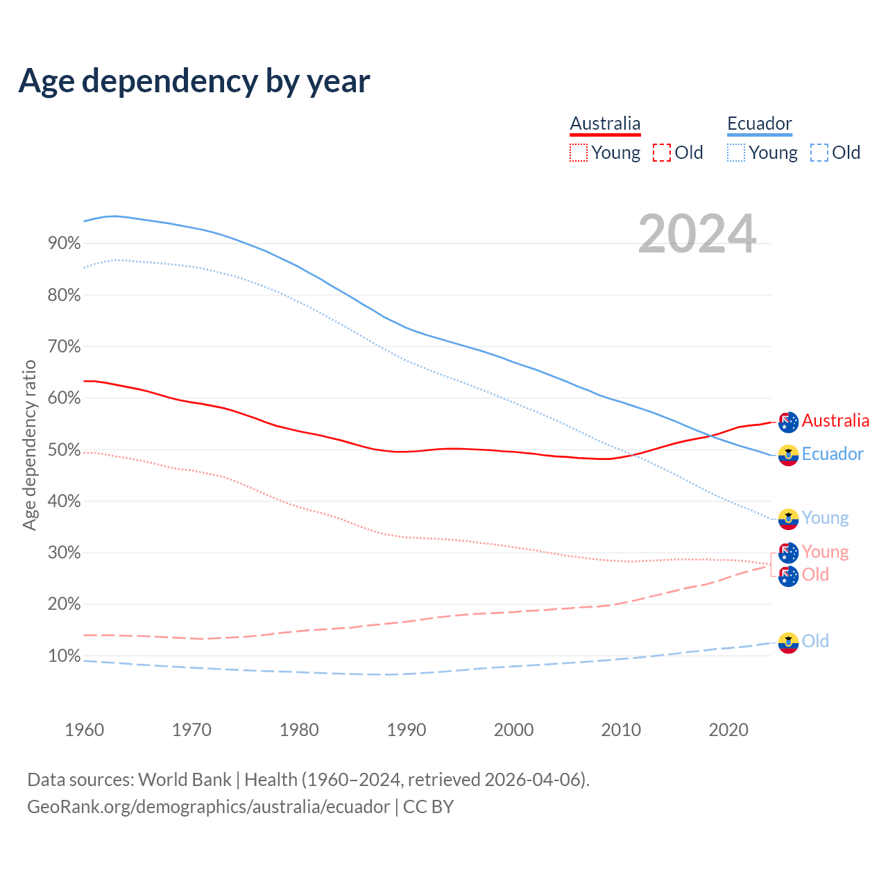 - The share of old-age demographic (65+) in Australia is 17.7% vs 8.34% in Ecuador.