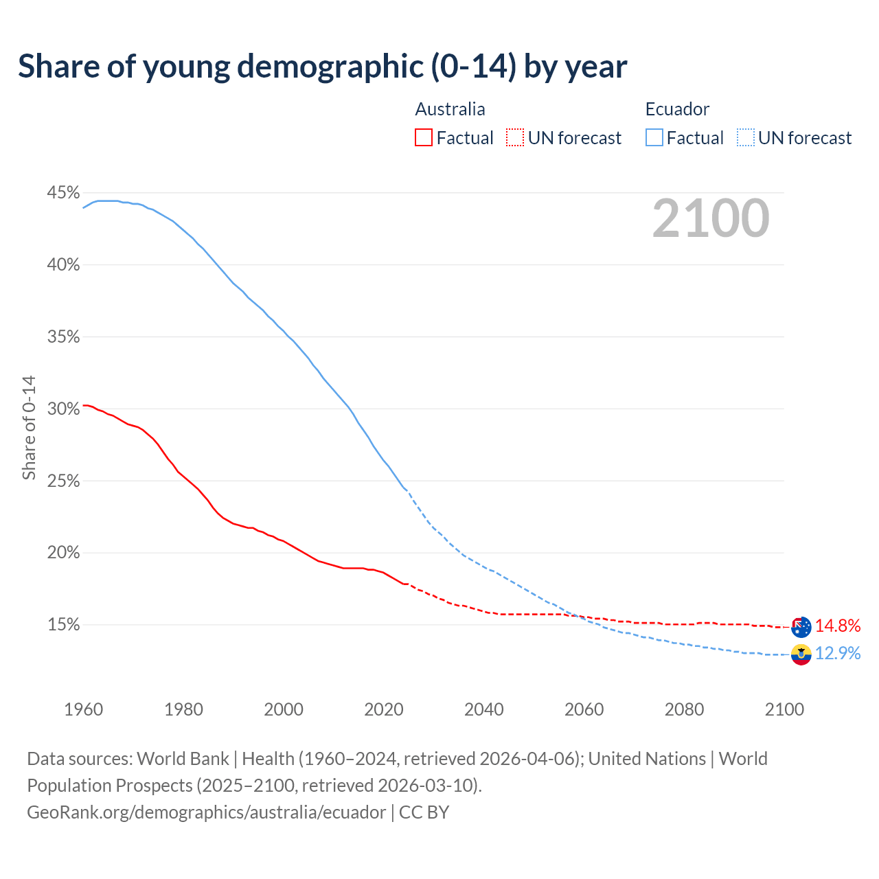 - The share of young demographic (0-15 years old) in Australia is 17.8% vs 24.5% in Ecuador.