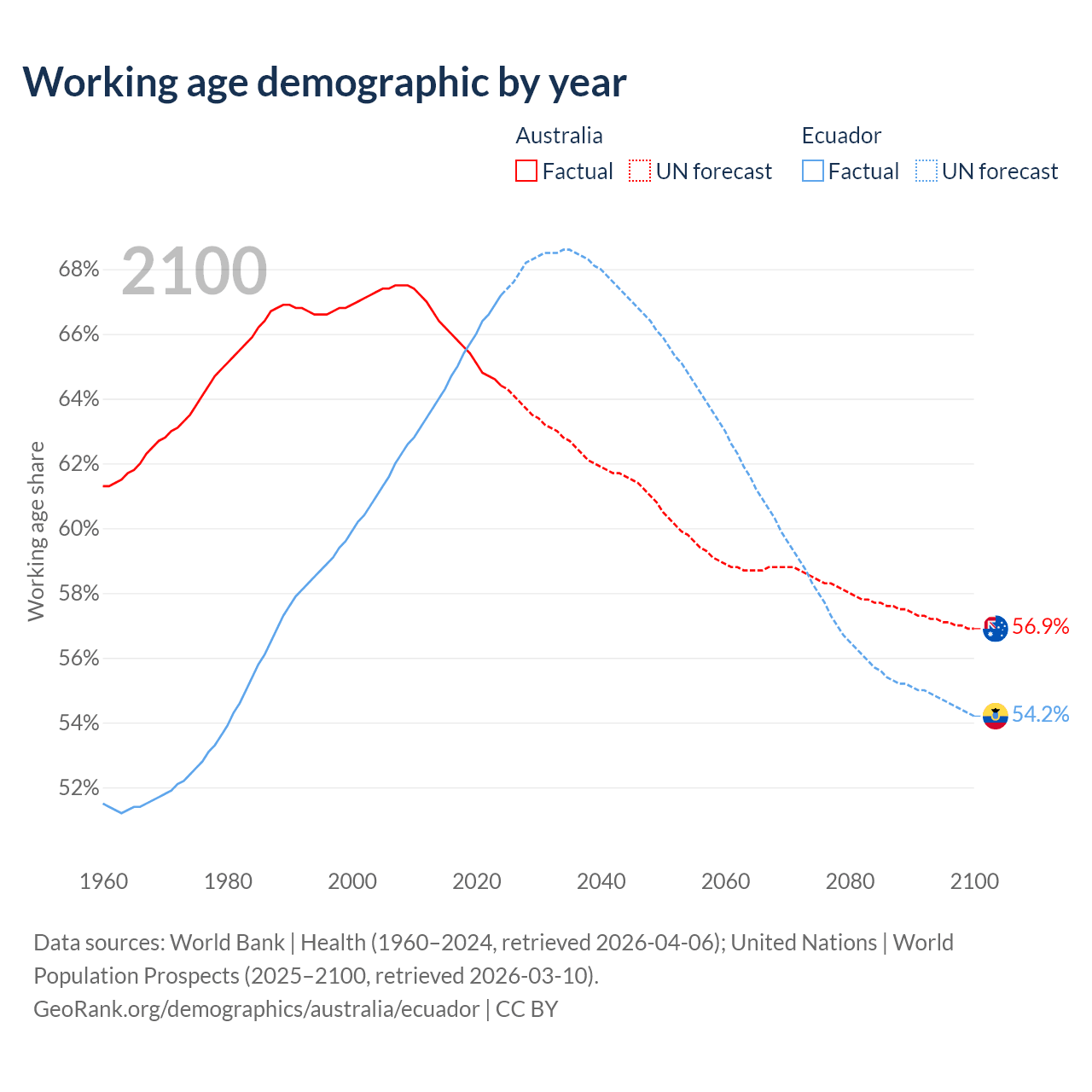 Median age Australia vs Ecuador, 1960-2100