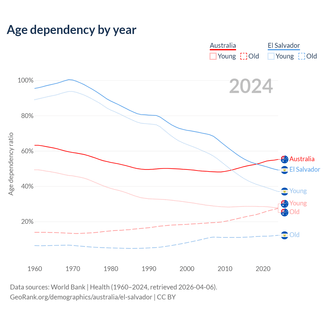 - The share of old-age demographic (65+) in Australia is 17.7% vs 8.15% in El Salvador.