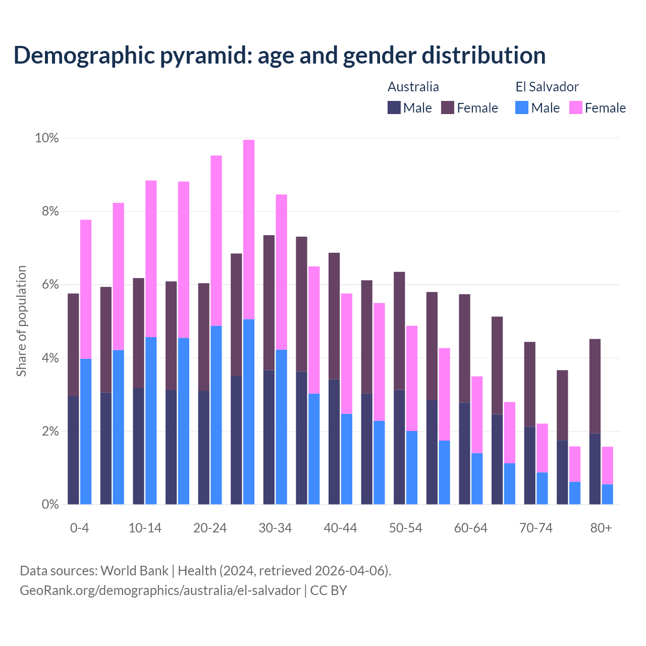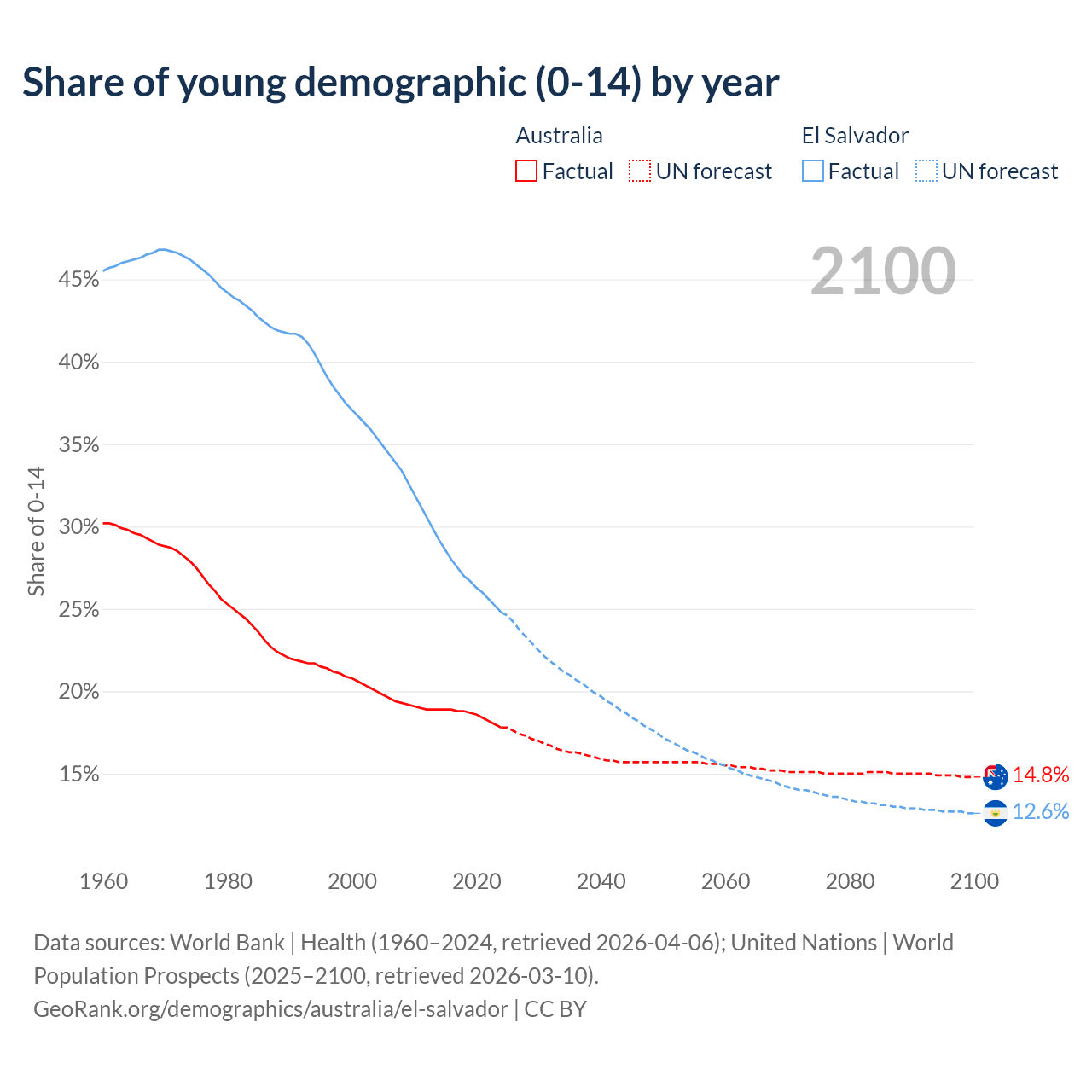 - The share of young demographic (0-15 years old) in Australia is 17.8% vs 24.8% in El Salvador.