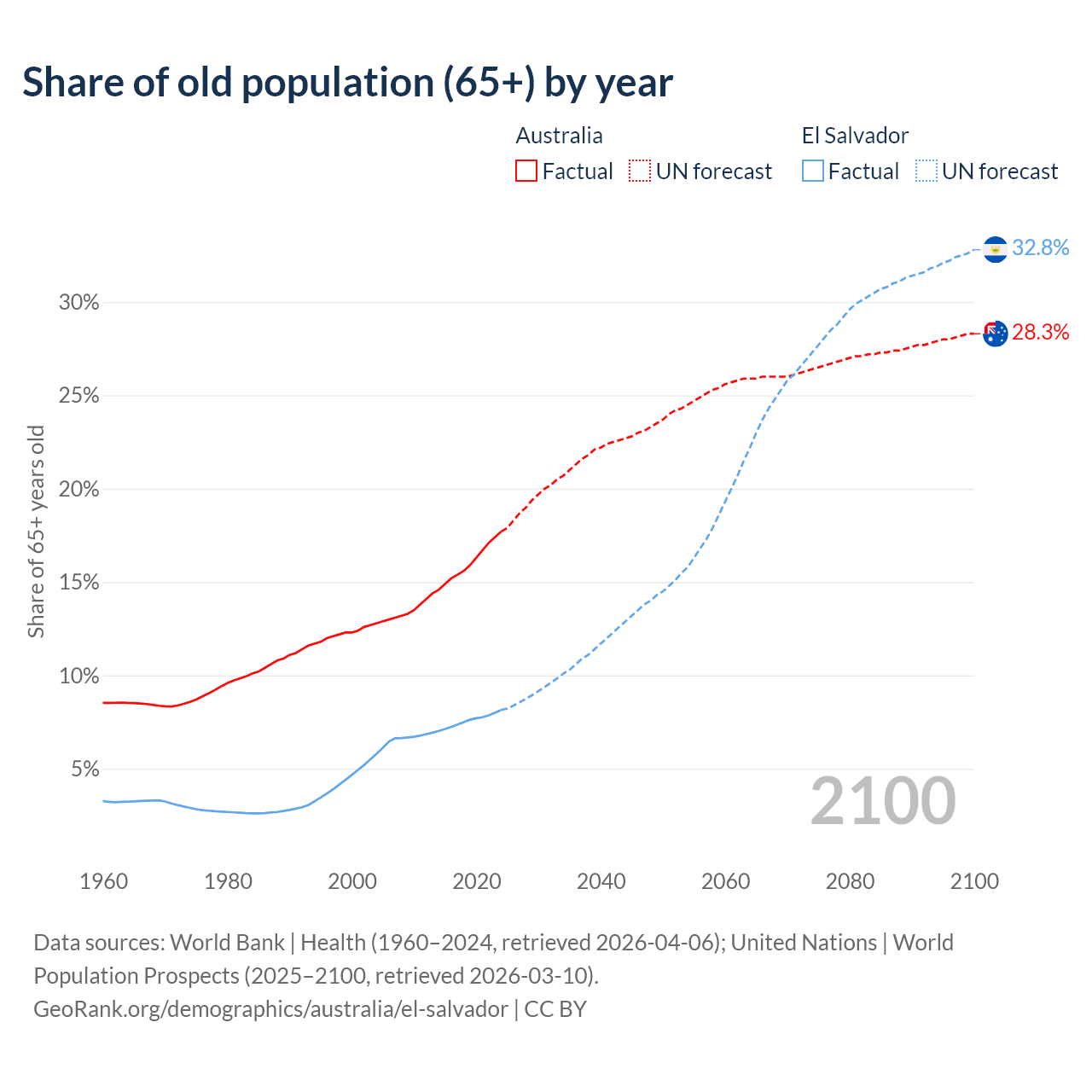 The share of older people aged 65 and over is 17.7% in Australia and 8.15% in El Salvador. Life expectancy in Australia compared to El Salvador .