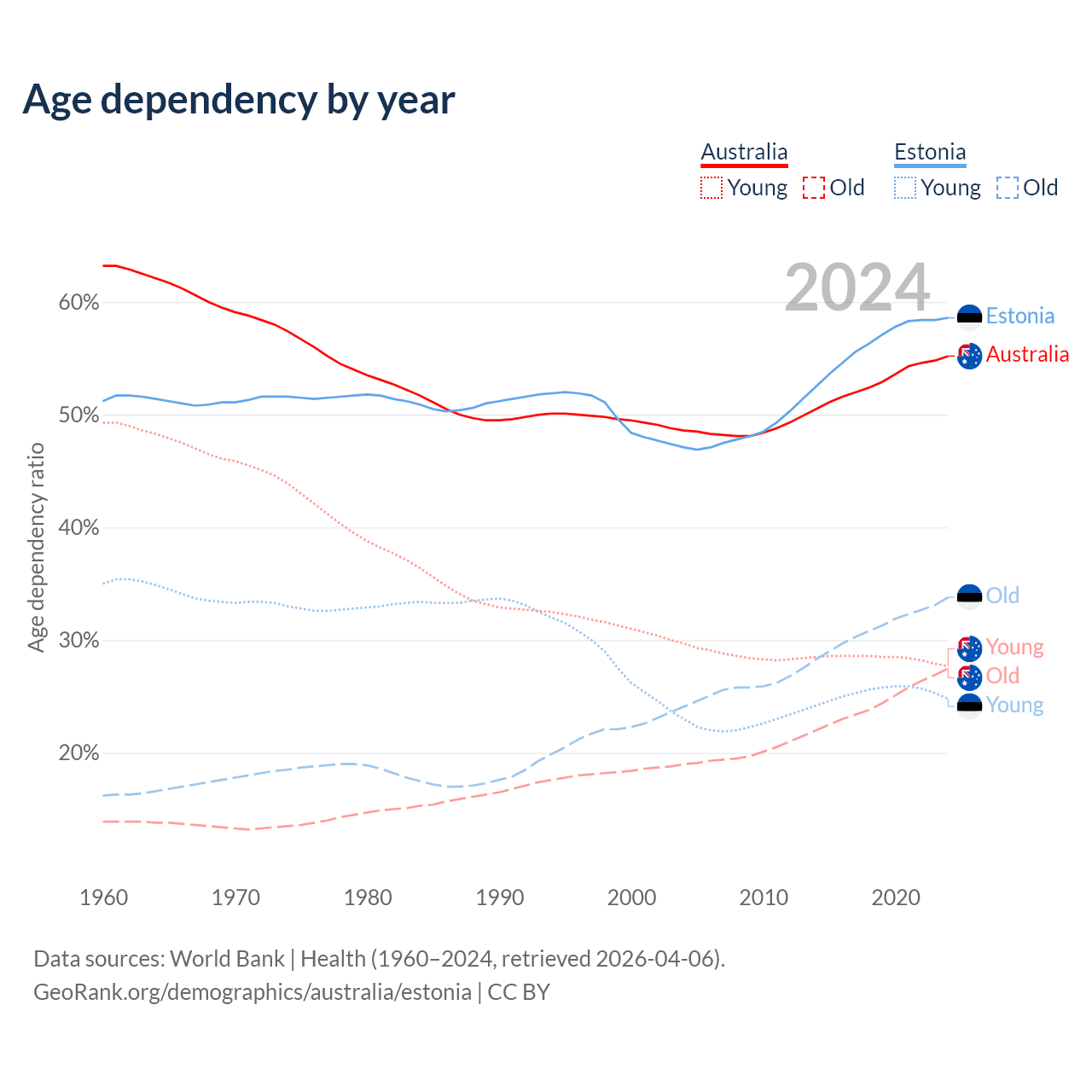 Data sources: World Bank | Health (1960–2024, retrieved 2026-04-06); U.S. Census Bureau (1960–2024, retrieved 2026-02-08).