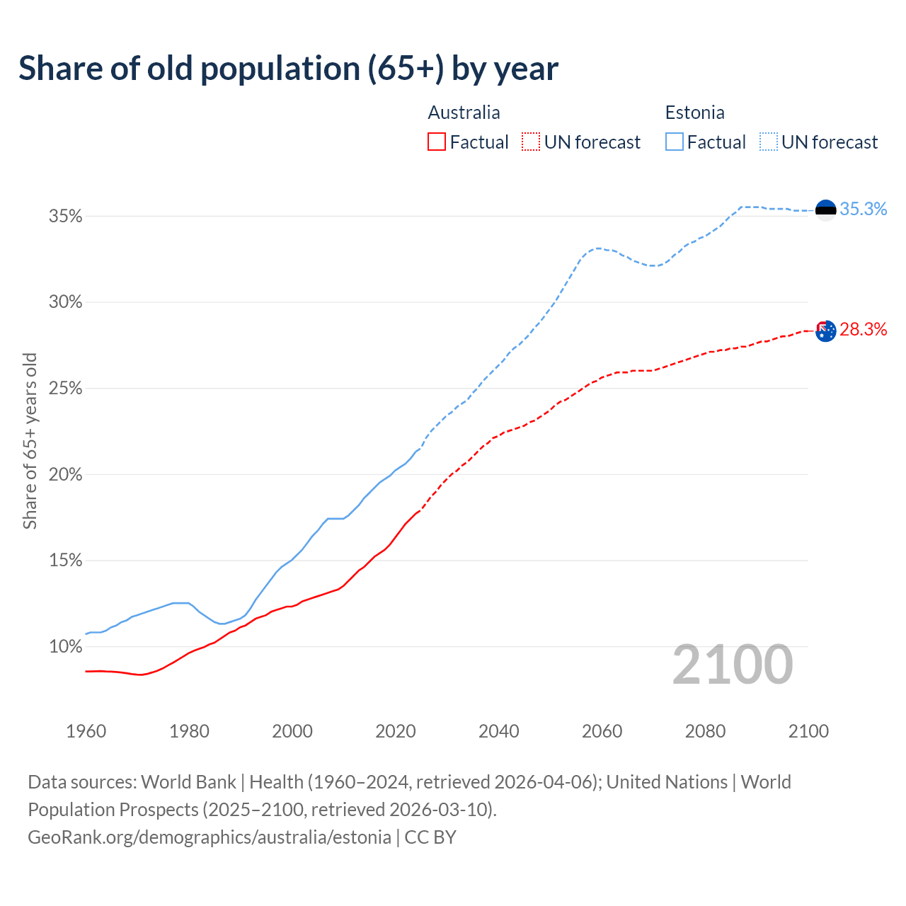 The share of older people aged 65 and over is 17.7% in Australia and 21.3% in Estonia. Life expectancy in Australia compared to Estonia .