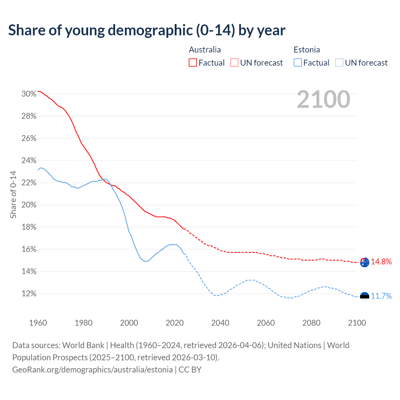 - The share of young demographic (0-15 years old) in Australia is 17.8% vs 15.6% in Estonia.
