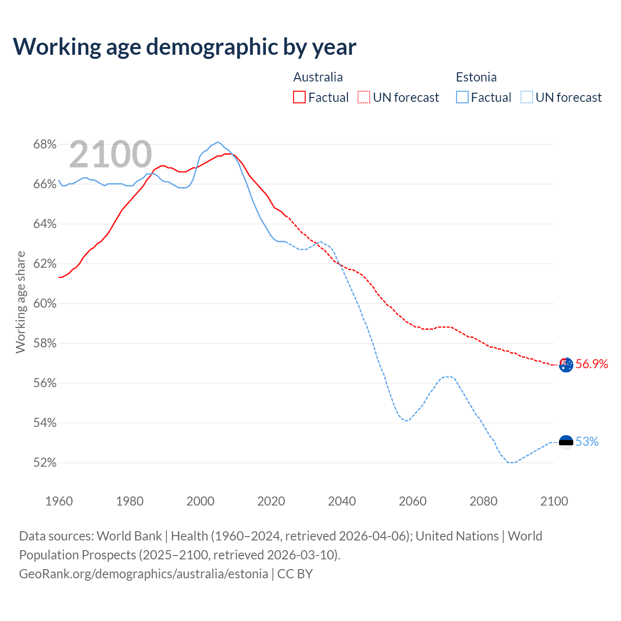 Median age Australia vs Estonia, 1960-2100