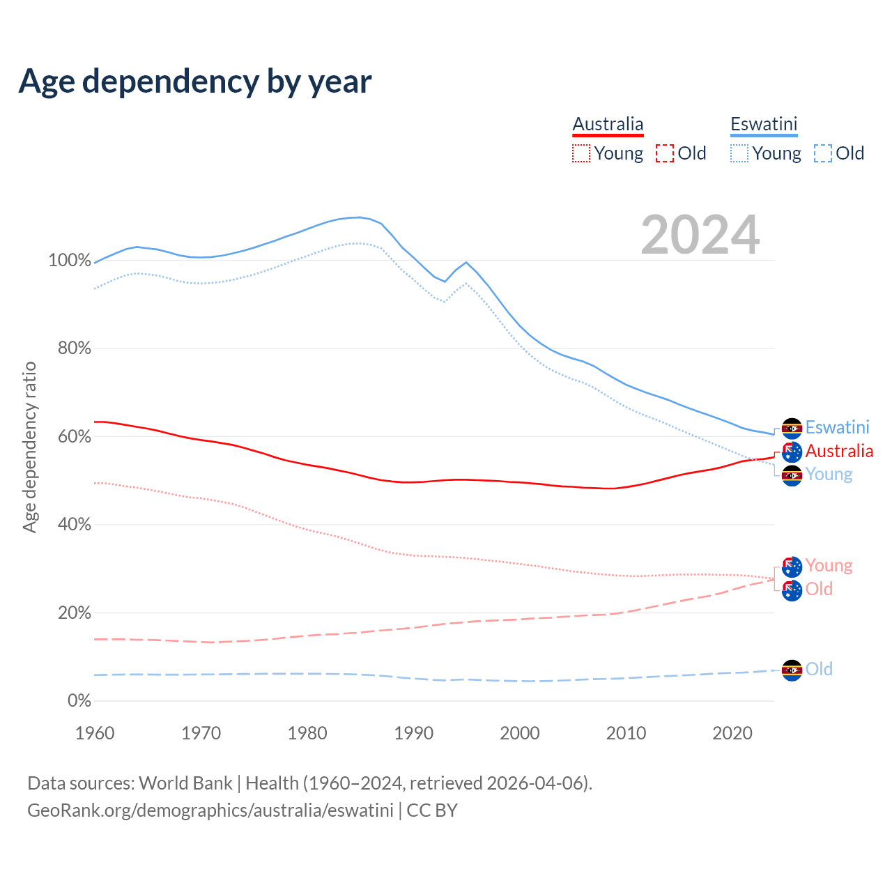 - The share of old-age demographic (65+) in Australia is 17.7% vs 4.26% in Eswatini.