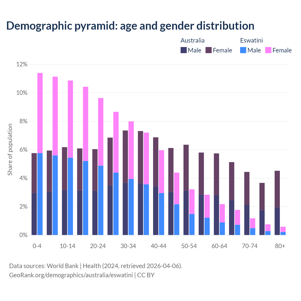 - As of 2026, the population of Australia is 27.8M vs 1.27M in Eswatini - 21.8 times difference.