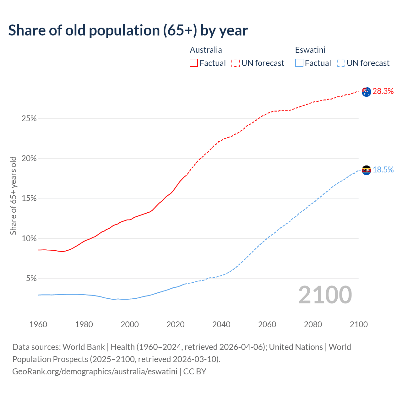 The share of older people aged 65 and over is 17.7% in Australia and 4.26% in Eswatini. Life expectancy in Australia compared to Eswatini .