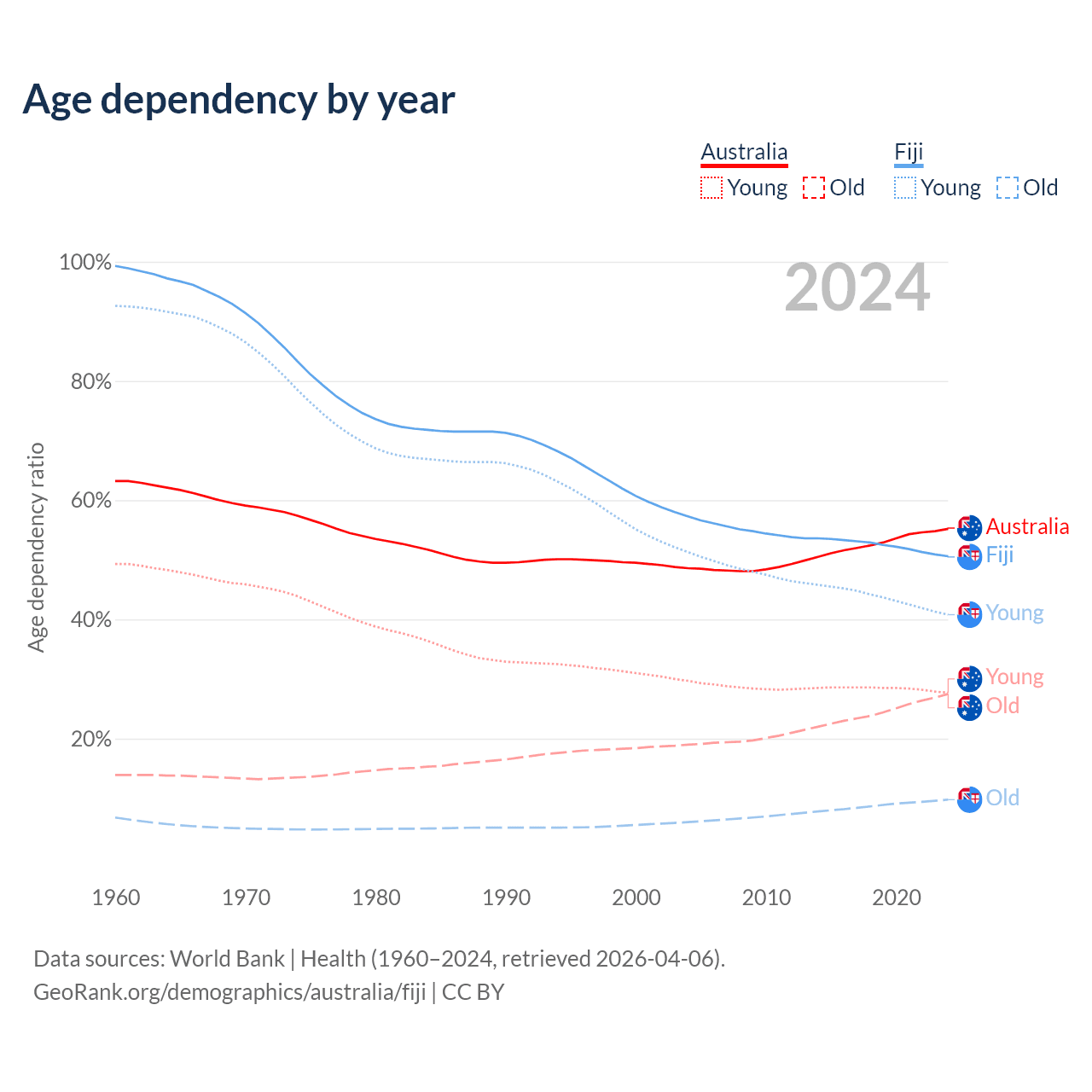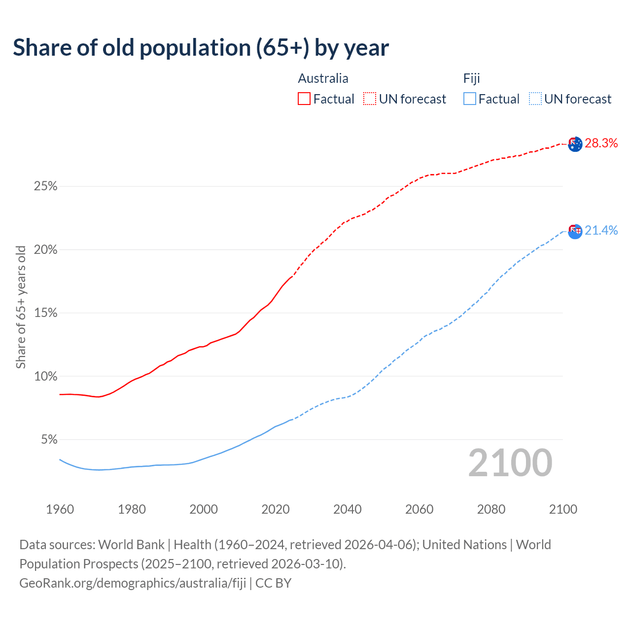 - The share of old-age demographic (65+) in Australia is 17.7% vs 6.49% in Fiji.