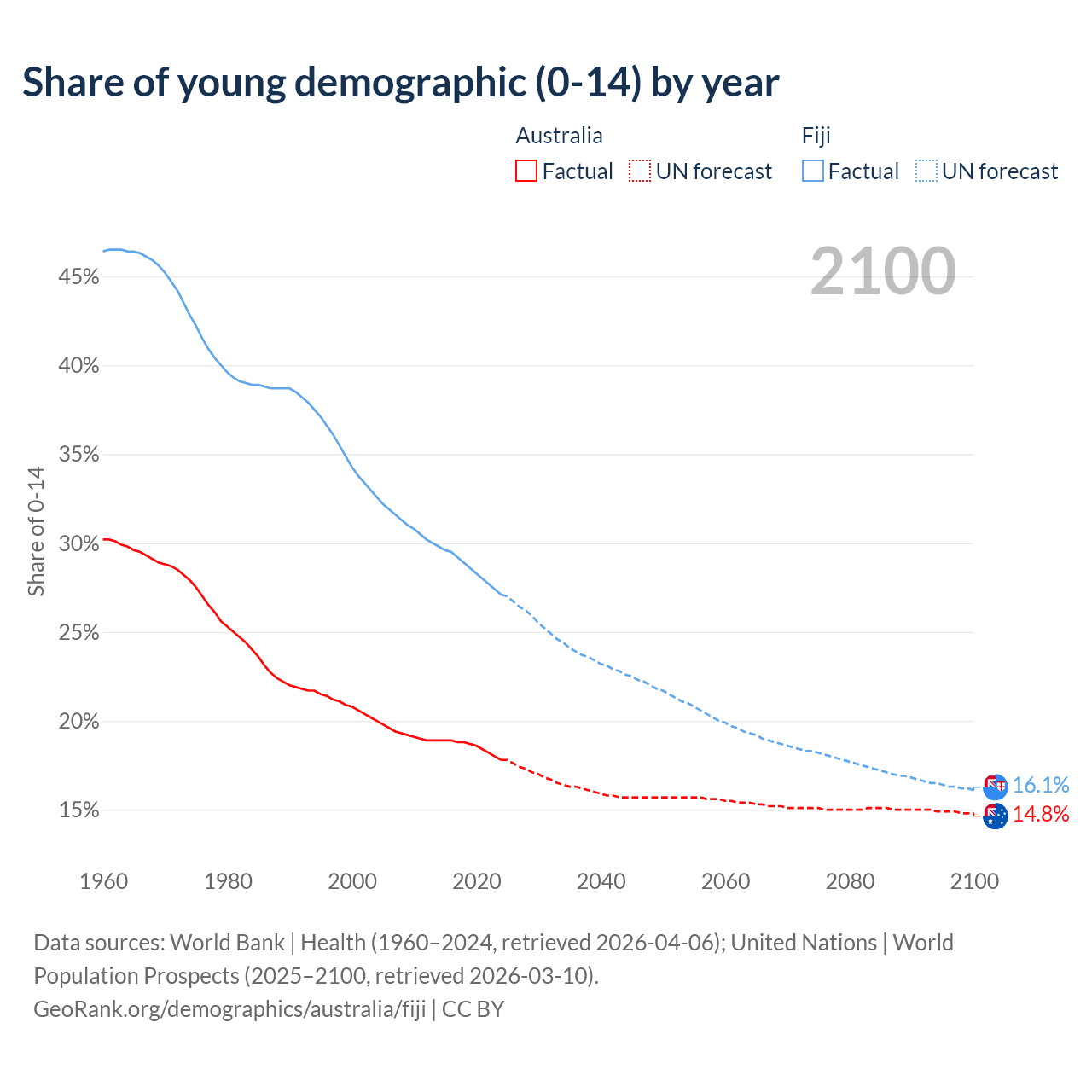 - The share of young demographic (0-15 years old) in Australia is 17.8% vs 27.1% in Fiji.