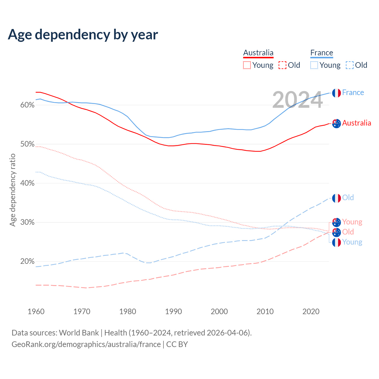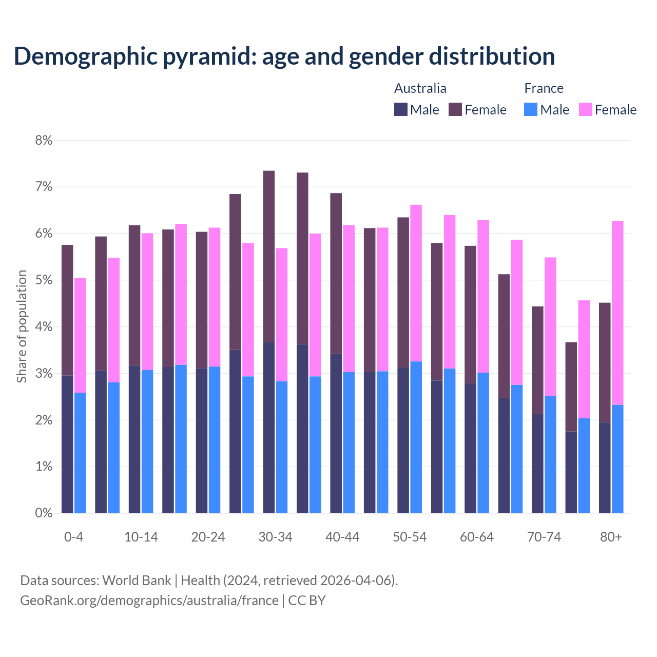 - Australia is ranked 55/196 by median age (oldest to youngest) vs 29/196 for France.